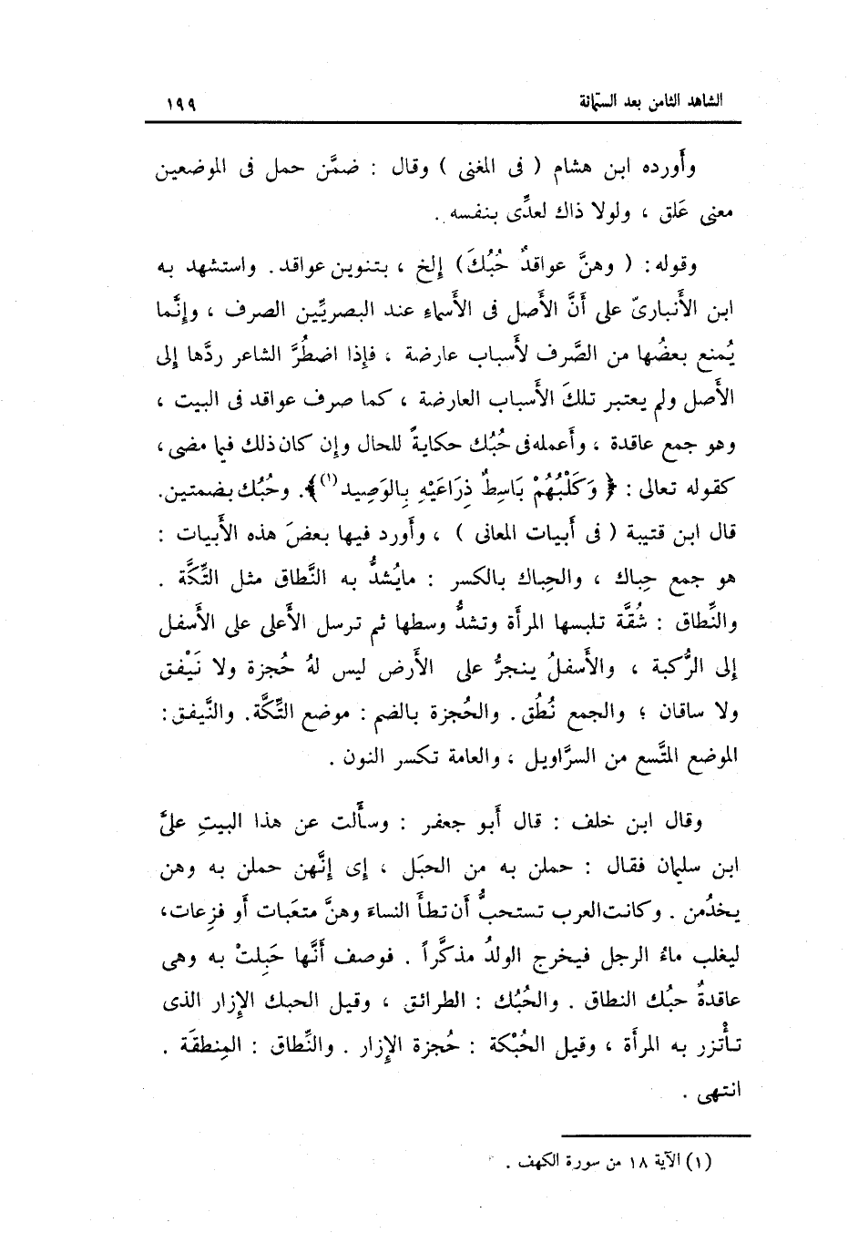 وَقَوله: وَهن عواقدٌ حبك إِلَخ بتنوين عواقد. وَاسْتشْهدَ بِهِ ابْن الْأَنْبَارِي على أَن الأَصْل فِي الْأَسْمَاء عِنْد الْبَصرِيين الصّرْف وَإِنَّمَا يمْنَع بَعْضهَا من الصّرْف لأسباب عارضة فَإِذا اضْطر الشَّاعِر ردهَا إِلَى الأَصْل وَلم يعْتَبر تِلْكَ الْأَسْبَاب الْعَارِضَة كَمَا صرف عواقد فِي الْبَيْت وَهُوَ جمع عاقدة وأعمله فِي حبك حِكَايَة للْحَال وَإِن كَانَ ذَلِك فِيمَا مضى كَقَوْلِه تَعَالَى: وكلبهم باسطٌ ذِرَاعَيْهِ بالوصيد.
