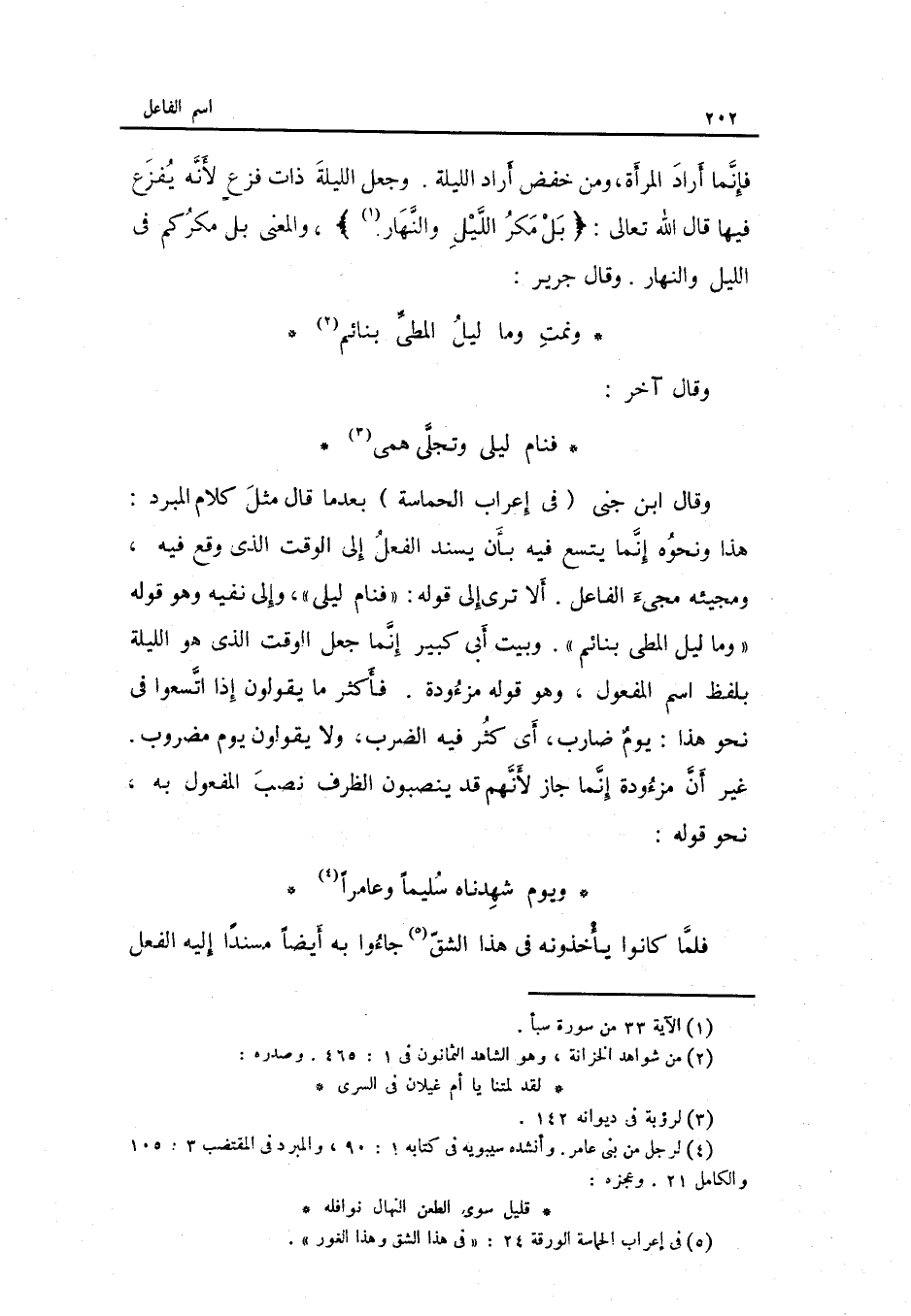 فَنَامَ ليلِي وتجلى همي وَقَالَ ابْن جني فِي إِعْرَاب الحماسة بعد مَا قَالَ مثل كَلَام الْمبرد: هَذَا وَنَحْوه إِنَّمَا يَتَّسِع فِيهِ بِأَن يسند الْفِعْل إِلَى الْوَقْت الَّذِي وَقع فِيهِ ومجيئة مَجِيء الْفَاعِل.