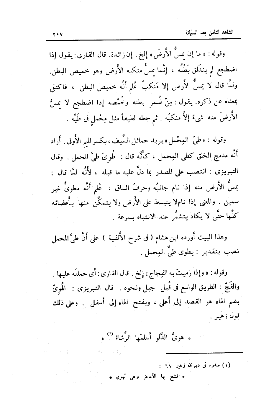 وَهَذَا الْبَيْت أوردهُ ابْن هِشَام فِي شرح الألفية على أَن طي الْمحمل نصب بِتَقْدِير: يطوي طي الْمحمل.
