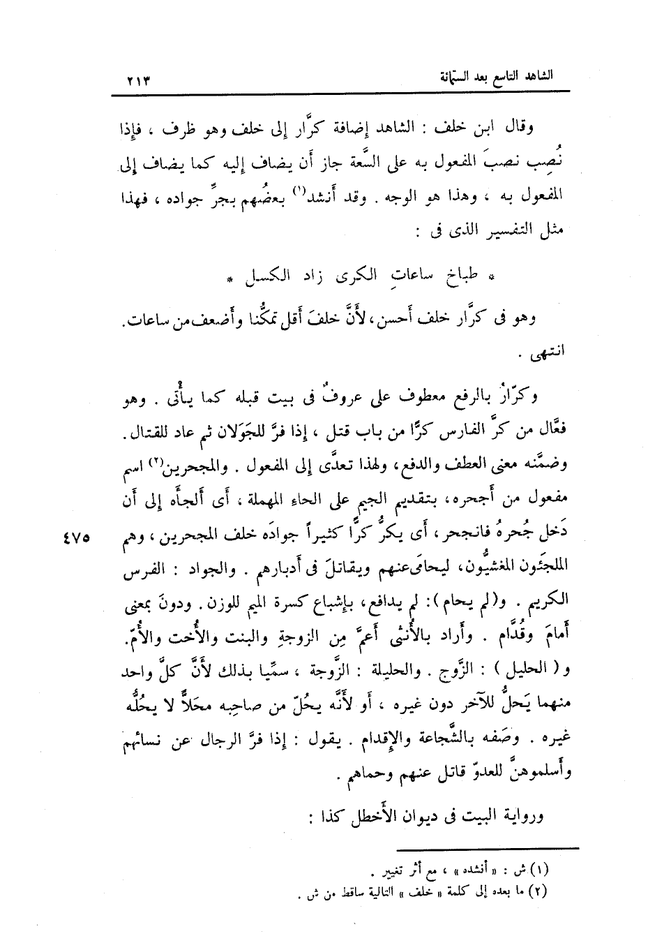 وَقد أنْشد بَعضهم بجر جَوَاده فَهَذَا مثل التَّفْسِير الَّذِي فِي: طباخ سَاعَات الْكرَى زَاد الكسل وَهُوَ فِي كرار خلف أحسن لِأَن خلف أقل تمَكنا وأضعف من سَاعَات. انْتهى.