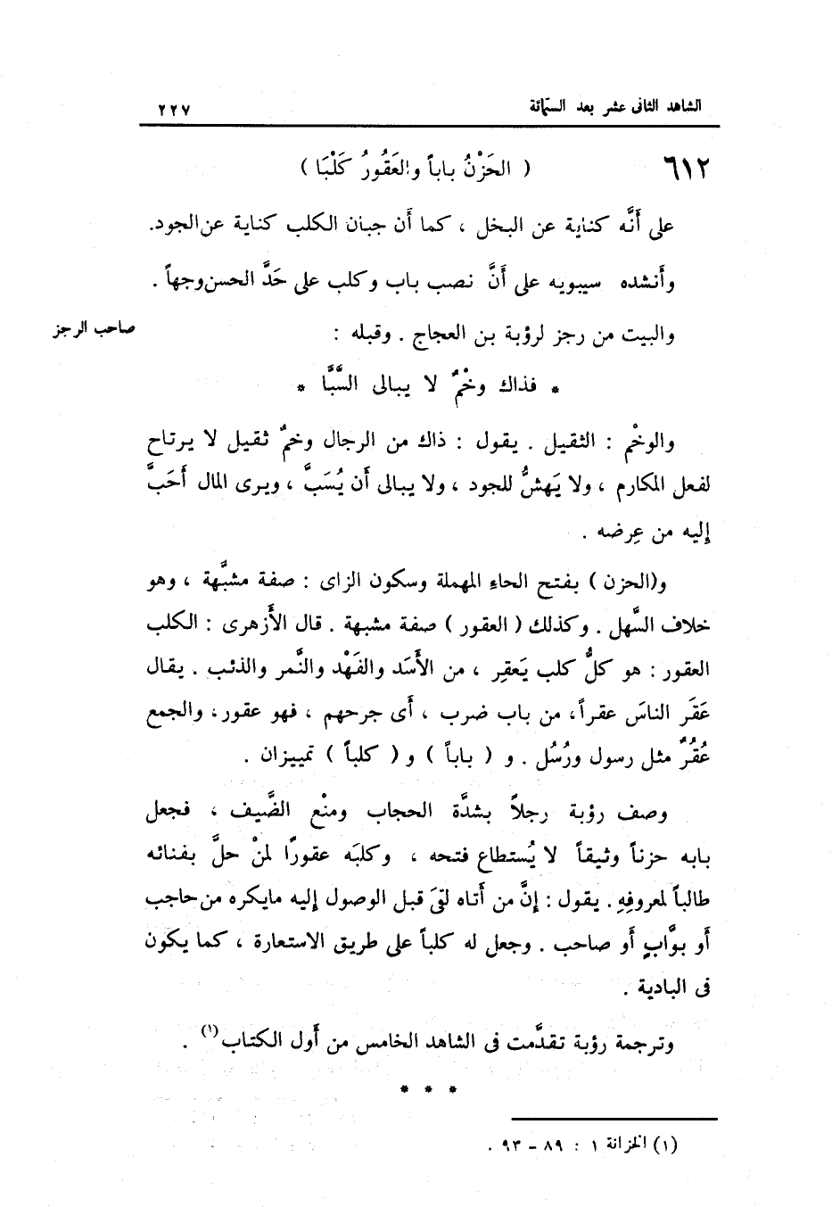 الرجز الْحزن بَابا والعقور كَلْبا على أَنه كِنَايَة عَن الْبُخْل كَمَا أَن جبان الْكَلْب كِنَايَة عَن الْجُود.