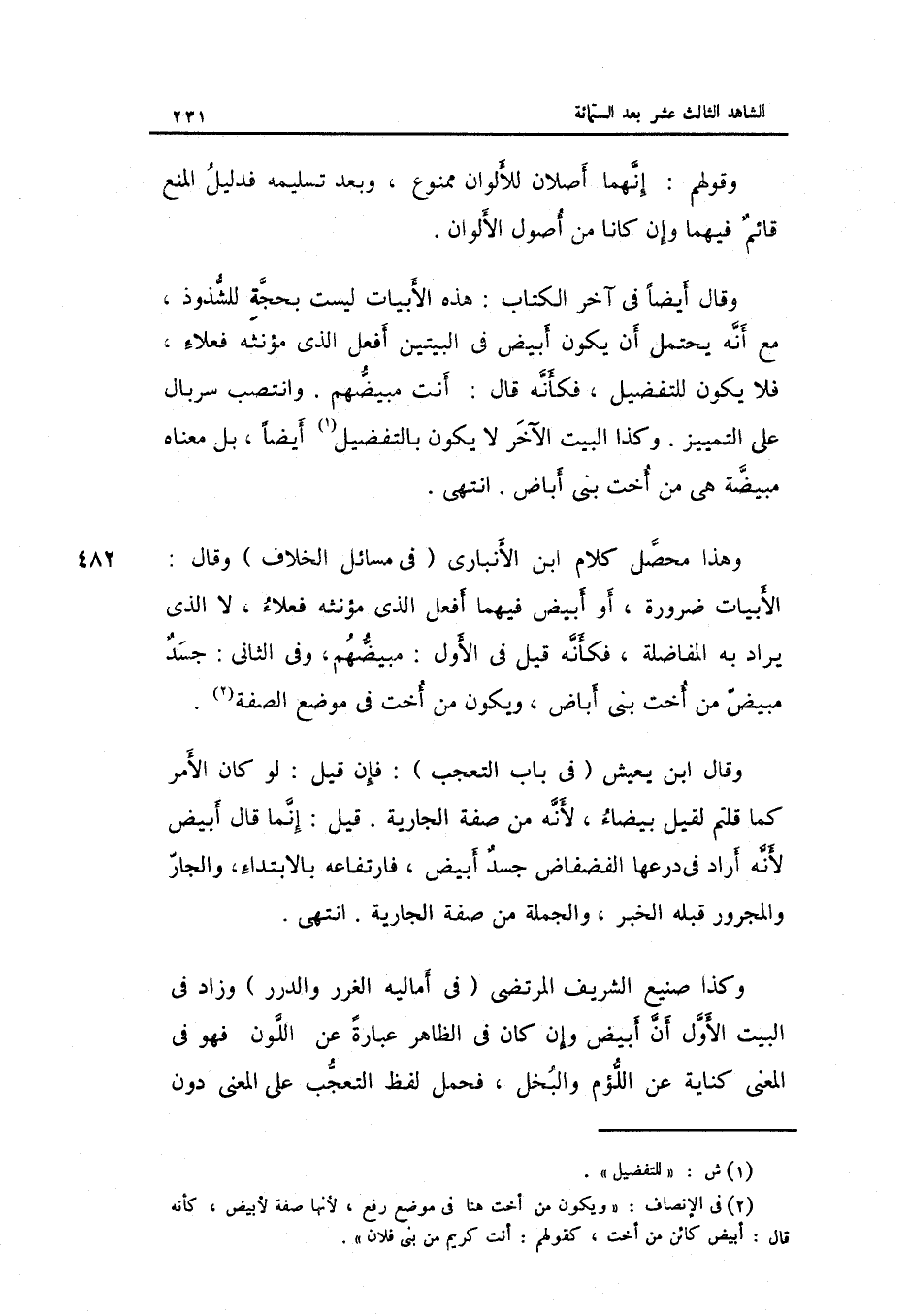 وَهَذَا مُحَصل كَلَام ابْن الْأَنْبَارِي فِي مسَائِل الْخلاف وَقَالَ: الأبيات ضَرُورَة أَو أَبيض فيهمَا أفعل الَّذِي مؤنثه فعلاء لَا الَّذِي يُرَاد بِهِ المفاضلة فَكَأَنَّهُ قيل فِي الأول: مبيضهم.