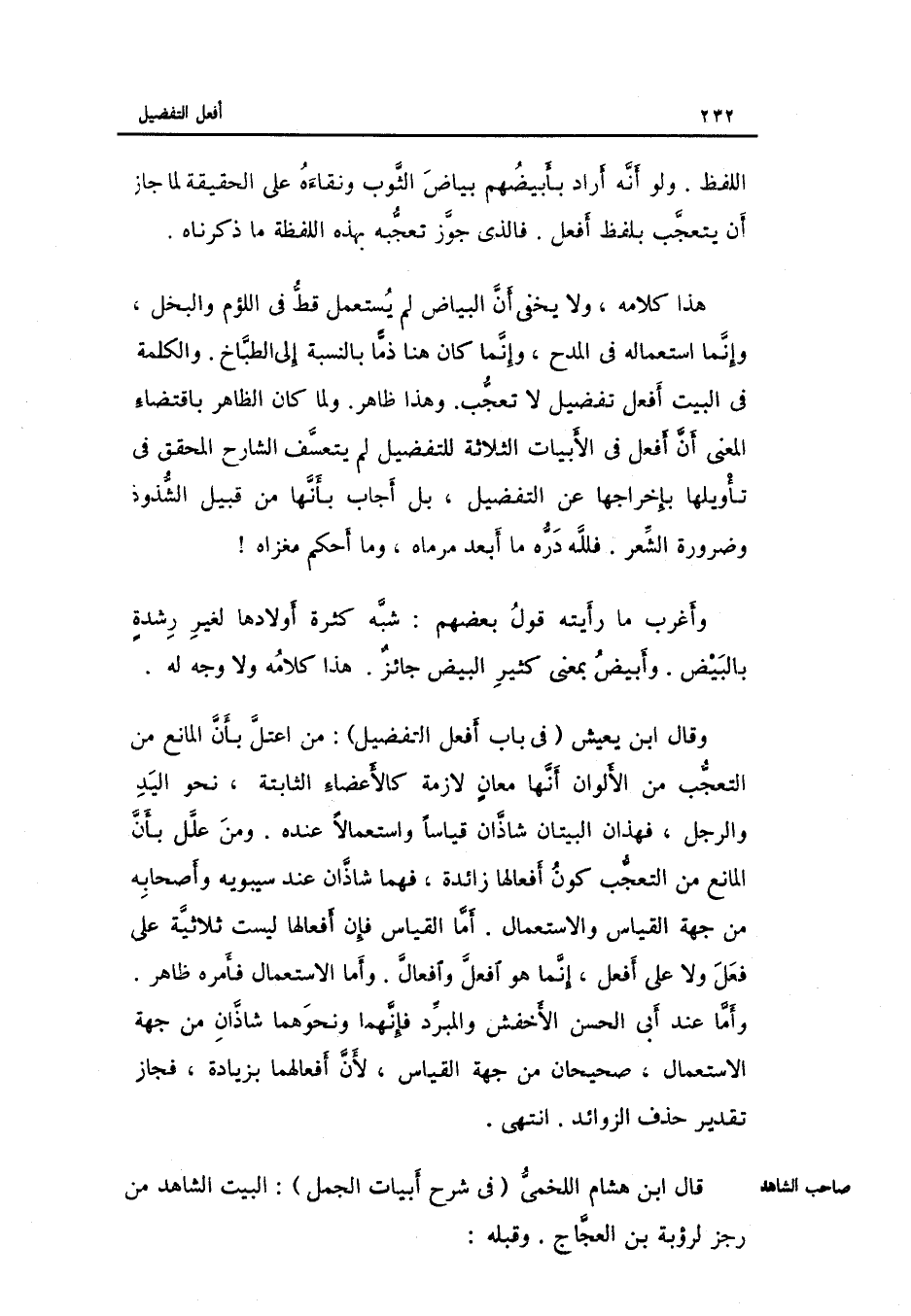 وَلما كَانَ الظَّاهِر باقتضاء الْمَعْنى أَن أفعل فِي الأبيات الثَّلَاثَة للتفضيل لم يتعسف الشَّارِح الْمُحَقق فِي تَأْوِيلهَا بإخراجها عَن التَّفْضِيل بل أجَاب بِأَنَّهَا من قبيل الشذوذ وضرورة الشّعْر. فَللَّه دره مَا أبعده مرماه وَمَا أحكم مغزاه وَأغْرب مَا رَأَيْته قَول بَعضهم: شبه كَثْرَة أَوْلَادهَا لغير رشدةٍ بالبيض. وأبيض بِمَعْنى كثير الْبيض جَائِز. هَذَا كَلَامه وَلَا وَجه لَهُ.