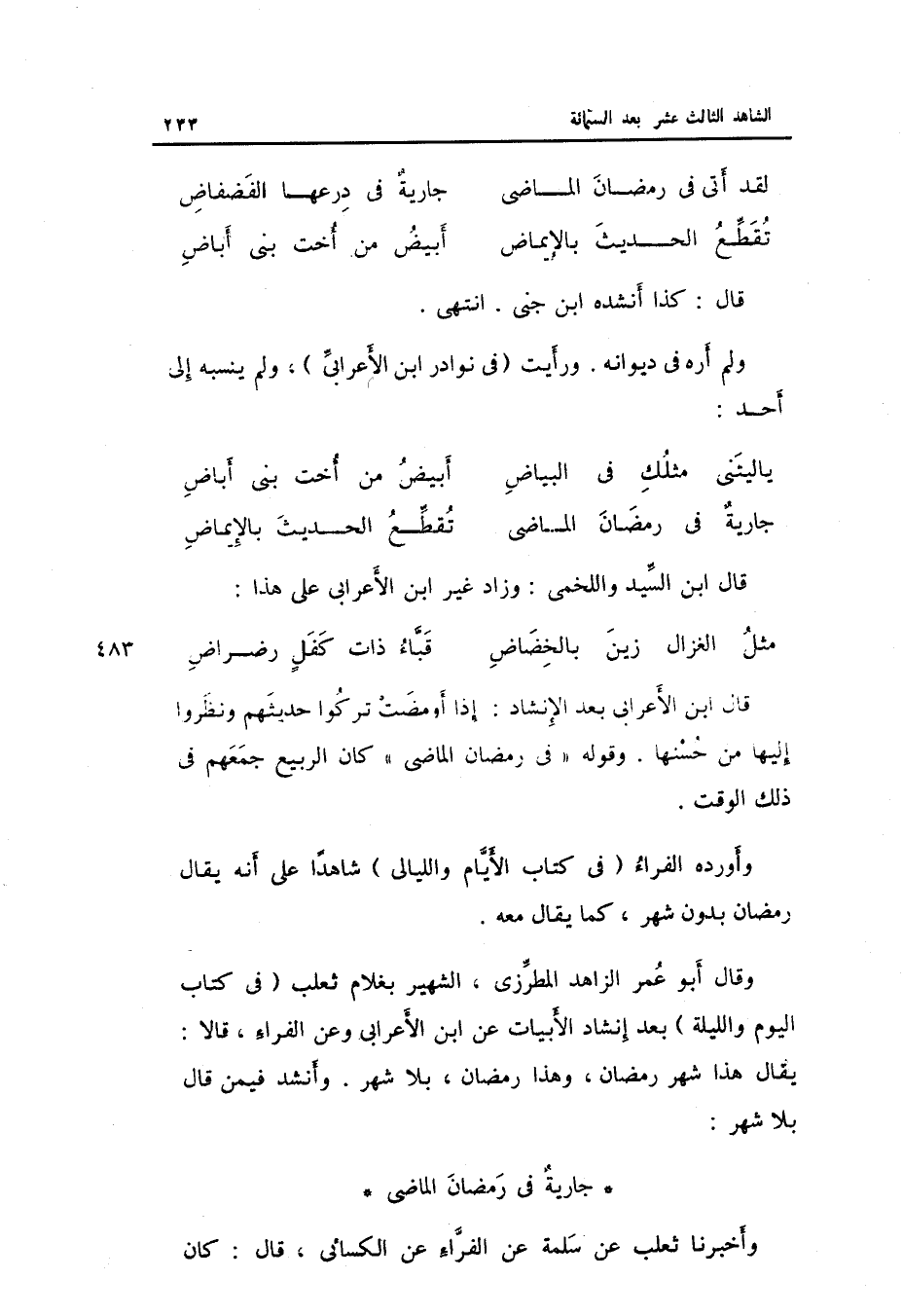 وَقَالَ أَبُو عمر الزَّاهِد المطرزي الشهير بِغُلَام ثَعْلَب فِي كتاب الْيَوْم وَاللَّيْلَة بعد إنشاد الأبيات عَن ابْن الْأَعرَابِي وَعَن الْفراء قَالَا: يُقَال هَذَا شهر رَمَضَان وَهَذَا رَمَضَان بِلَا شهر.