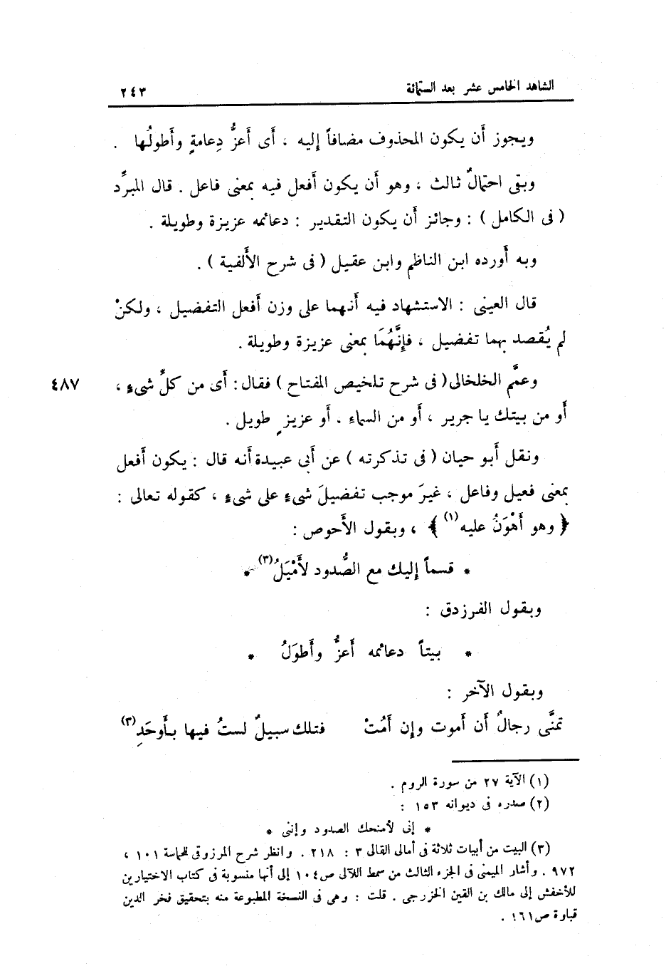 قَالَ الْعَيْنِيّ: الاستشهاد فِيهِ أَنَّهُمَا على وزن أفعل التَّفْضِيل وَلَكِن لم يقْصد بهما تَفْضِيل فَإِنَّهُمَا وعمم الخلخالي فِي شرح تَلْخِيص الْمِفْتَاح فَقَالَ: أَي من كل شَيْء أَو من بَيْتك يَا جرير أَو من السَّمَاء أَو غزيزٍ طَوِيل.