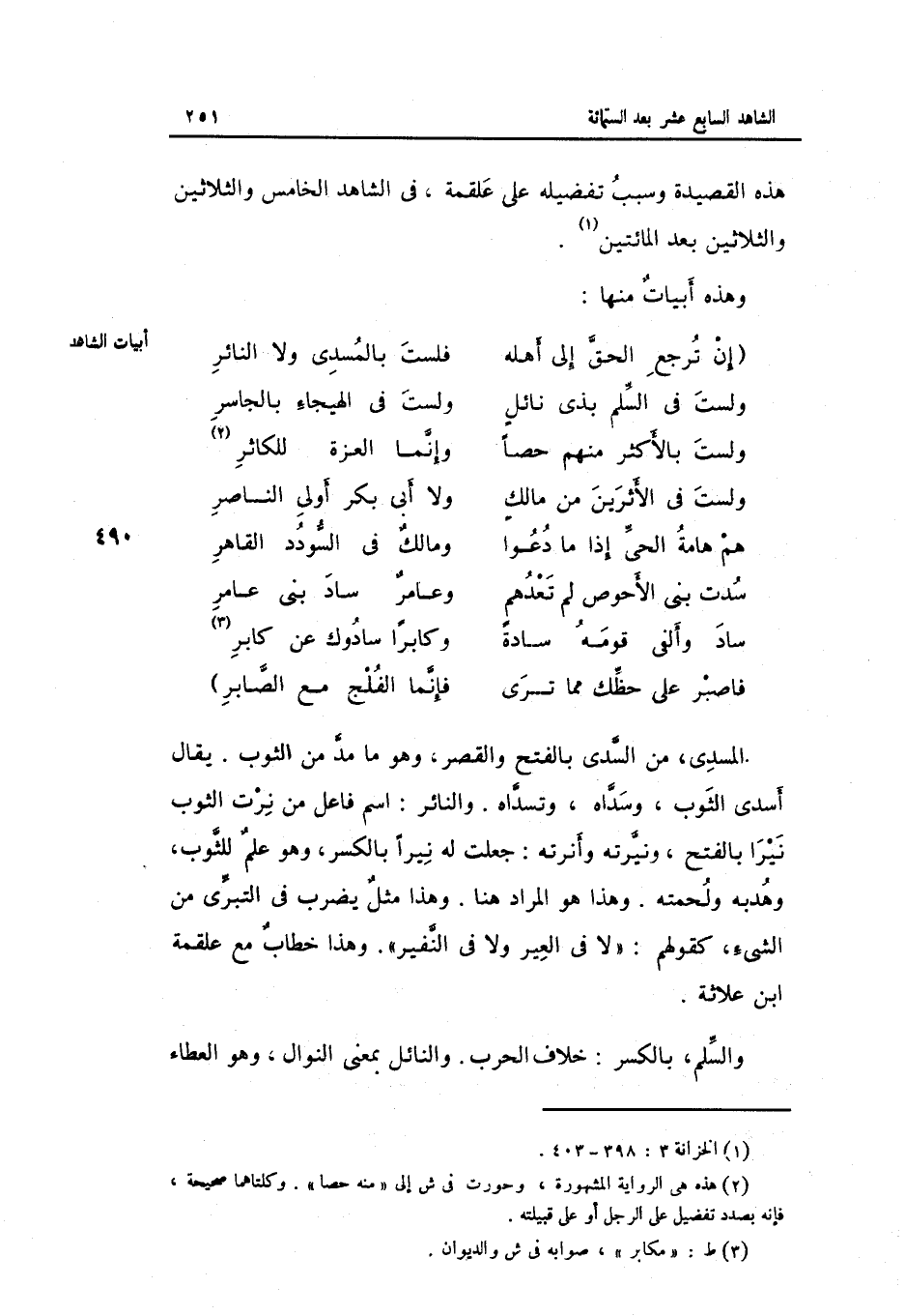 هَذِه القصيدة وَسبب تفضيله على عَلْقَمَة فِي الشَّاهِد الْخَامِس وَالثَّلَاثِينَ بعد الْمِائَتَيْنِ.