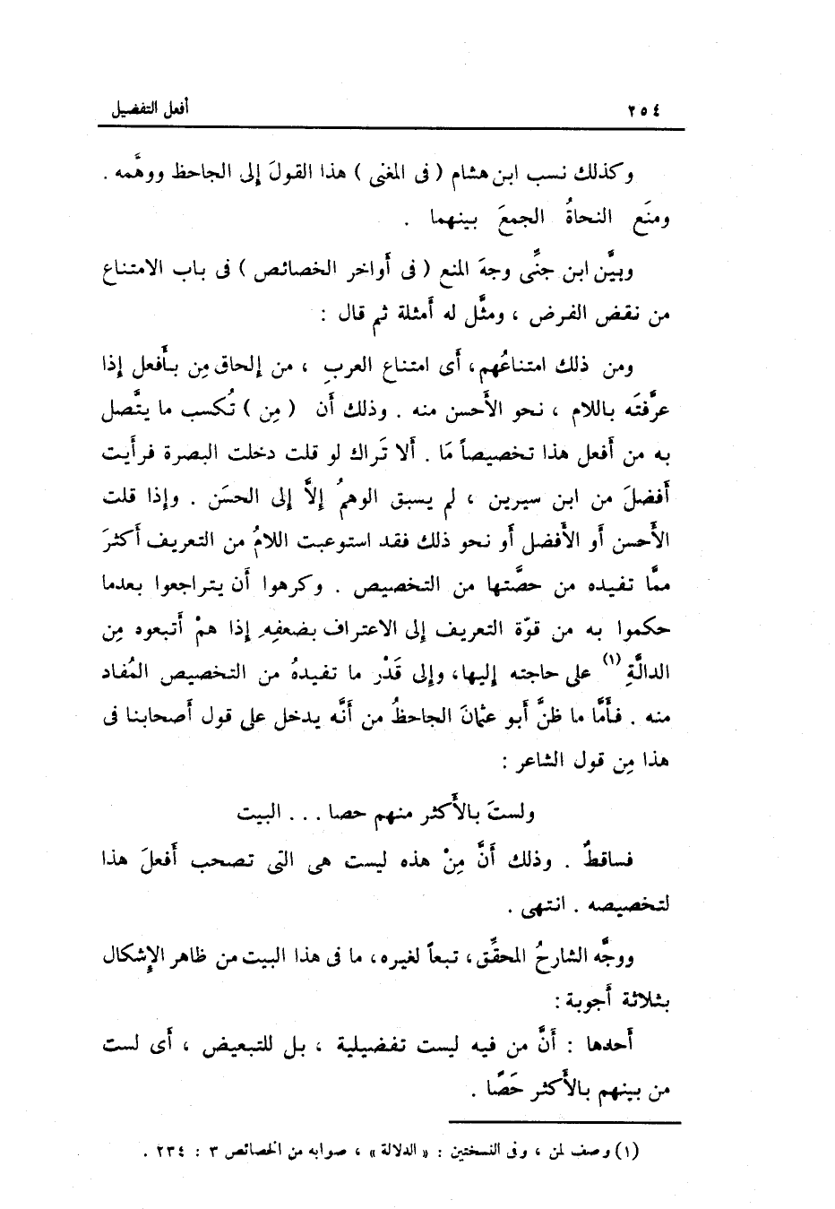 فَأَما مَا ظن أَبُو عُثْمَان الجاحظ من أَنه يدْخل على أَصْحَابنَا فِي هَذَا من قَول الشَّاعِر: وَلست بِالْأَكْثَرِ مِنْهُم حصاً ... ... ... الْبَيْت فساقط. وَذَلِكَ أَن من هَذِه لَيست هِيَ الَّتِي تصْحَب أفعل هَذَا لتخصيصه. انْتهى.