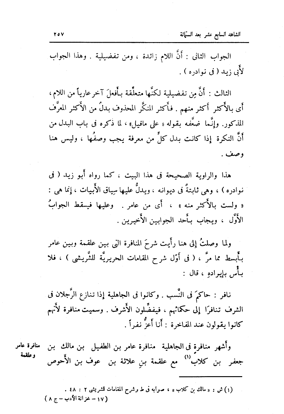 وَلما وصلت إِلَى هُنَا رَأَيْت شرح المنافرة الَّتِي بَين عَلْقَمَة وَبَين عَامر بأبسط مِمَّا مر فِي أول شرح المقامات الحريرية للشريشي فَلَا بَأْس بإيراد قَالَ: نافر: حَاكم فِي النّسَب. وَكَانُوا فِي الْجَاهِلِيَّة إِذا تنَازع الرّجلَانِ فِي الشّرف تنافرا إِلَى حكمائهم فيفضلون الْأَشْرَف. وَسميت منافرة لأَنهم كَانُوا يَقُولُونَ عِنْد الْمُفَاخَرَة: أَنا أعز نَفرا.