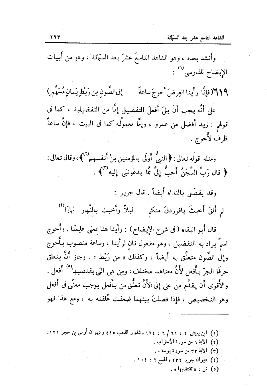 على أَنه يجب أَن يَلِي أفعل التَّفْضِيل إِمَّا من التفضيلية كَمَا فِي قَوْلهم: زيد أفضل من عَمْرو وَإِمَّا معموله كَمَا فِي الْبَيْت فَإِن سَاعَة ظرف لأحوج.