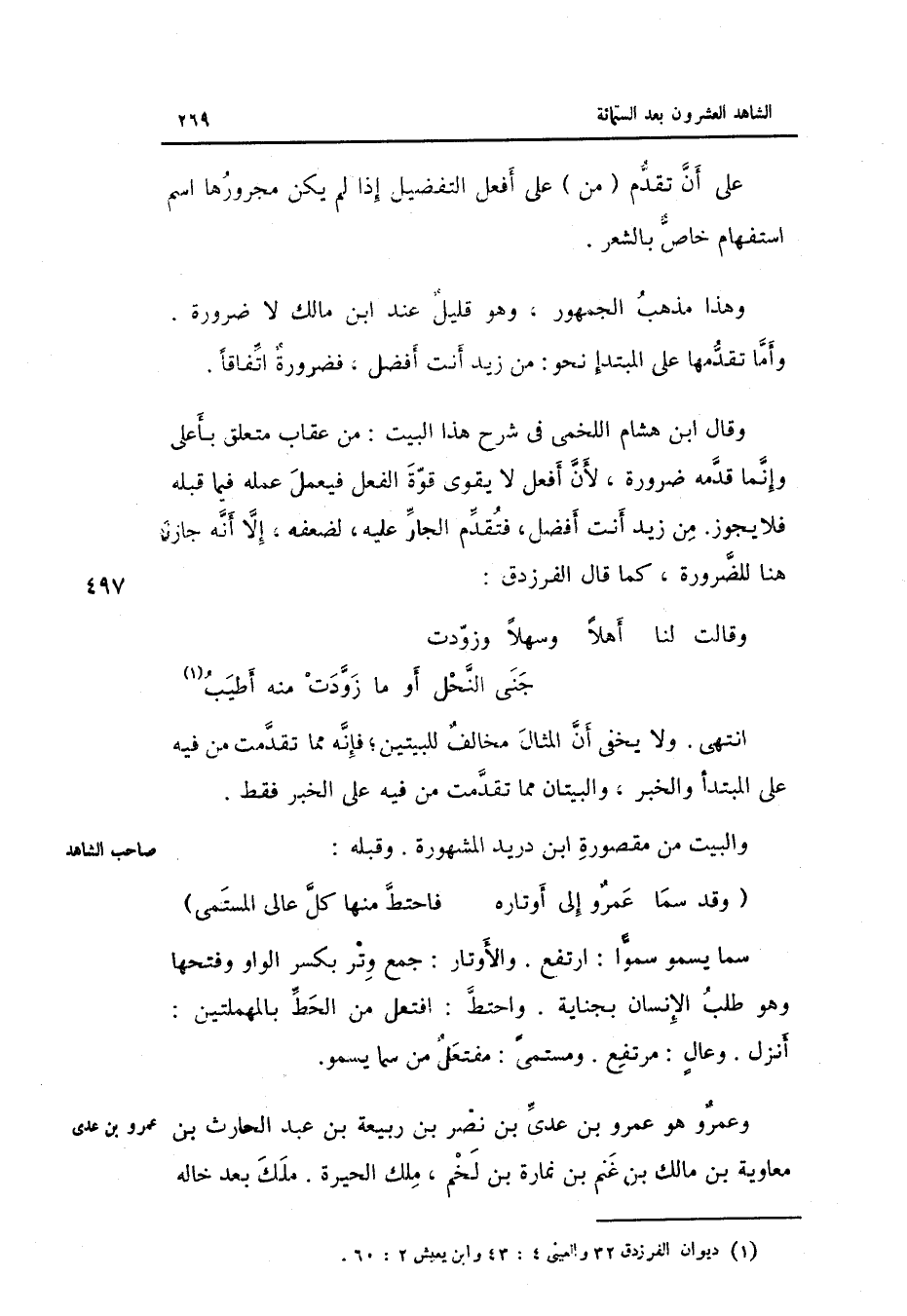 وَقَالَ ابْن هِشَام اللَّخْمِيّ فِي شرح هَذَا الْبَيْت: من عِقَاب مُتَعَلق بِأَعْلَى وَإِنَّمَا قدمه ضَرُورَة لِأَن أفعل لَا يقوى قُوَّة الْفِعْل فَيعْمل عمله فِيمَا قبله فَلَا يجوز. من زيد أَنْت أفضل فَتقدم الْجَار عَلَيْهِ لضَعْفه إِلَّا أَنه جَازَ هُنَا للضَّرُورَة.