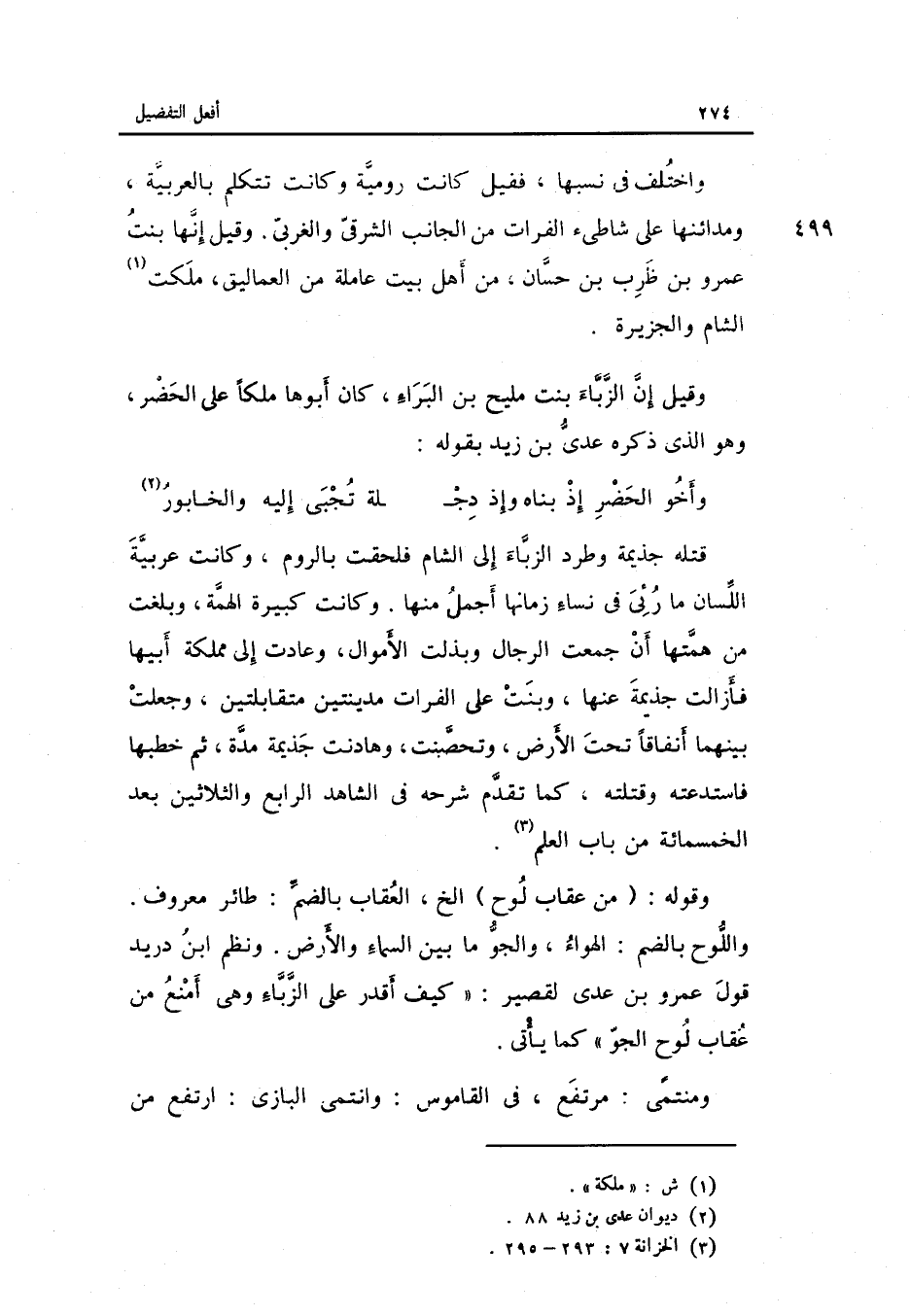 قَتله جذيمة وطرد الزباء إِلَى الشَّام فلحقت بالروم. وَكَانَت عَرَبِيَّة اللِّسَان مَا رئي فِي نسَاء زمانها أجمل مِنْهَا. وَكَانَت كَبِيرَة الهمة وَبَلغت من همتها أَن جمعت الرِّجَال وبذلت الْأَمْوَال وعادت إِلَى مملكة أَبِيهَا فأزالت جذيمة عَنْهَا وَبنت على الْفُرَات مدينتين متقابلتين وَجعلت بَينهمَا أنفاقاً تَحت الأَرْض وتحصنت وهادنت جذيمة مُدَّة ثمَّ خاطبها فاستدعته وقتلته كَمَا تقدم شَرحه فِي الشَّاهِد الرَّابِع وَالثَّلَاثِينَ بعد الْخَمْسمِائَةِ من بَاب الْعلم.