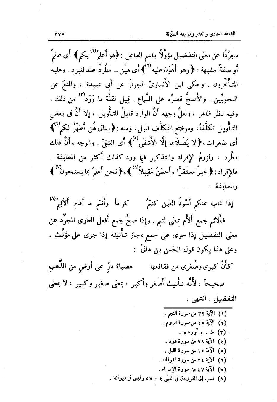 قيل لقلَّة مَا ورد من ذَلِك. وَفِيه نظر ظَاهر وَلَعَلَّ وَجهه أَن الْوَارِد قابلٌ للتأويل إِلَّا أَن فِي بعض التَّأْوِيل تكلفاً وَمَوْضِع التَّكَلُّف قَلِيل وَمِنْه: بَنَاتِي هن أطهر لكم أَي: طاهرات لَا يصلاها إِلَّا الأشقى أَي: الشقي. وَالْوَجْه أَن ذَلِك مطرد وَلُزُوم الْإِفْرَاد والتذكير فِيمَا ورد كَذَلِك أَكثر من الْمُطَابقَة.