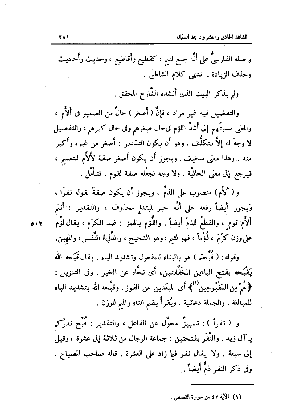 وألأم مَنْصُوب على الذَّم وَيجوز أَن يكون صفة لقَوْله: نَفرا وَيجوز أَيْضا رَفعه على أَنه خبر لمبتدأ مَحْذُوف وَالتَّقْدِير: أَنْتُم ألأم قومٍ وَالْقطع للذم أَيْضا. واللؤم بِالْهَمْز: ضد الْكَرم يُقَال: لؤم على وزن كرم فَهُوَ لئيم وَهُوَ الشحيح والدنيء النَّفس والمهين.)
