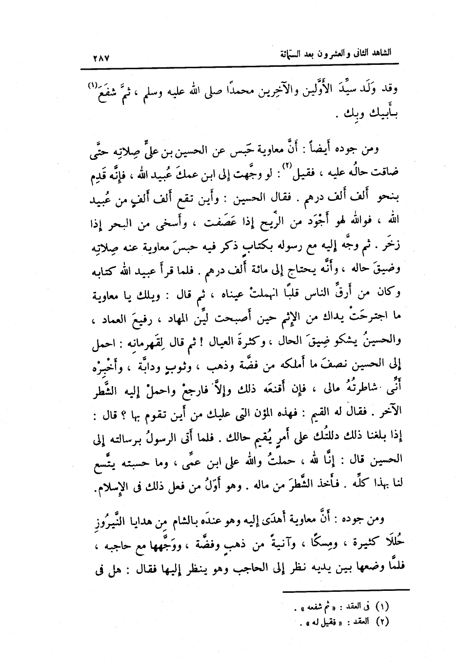 وَمن جوده أَيْضا: أَن مُعَاوِيَة حبس عَن الْحُسَيْن بن عَليّ صلَاته حَتَّى ضَاقَتْ حَاله عَلَيْهِ فَقيل: لَو وجهت إِلَى ابْن عمك عبيد الله فَإِنَّهُ قدم بِنَحْوِ ألف ألف دِرْهَم.