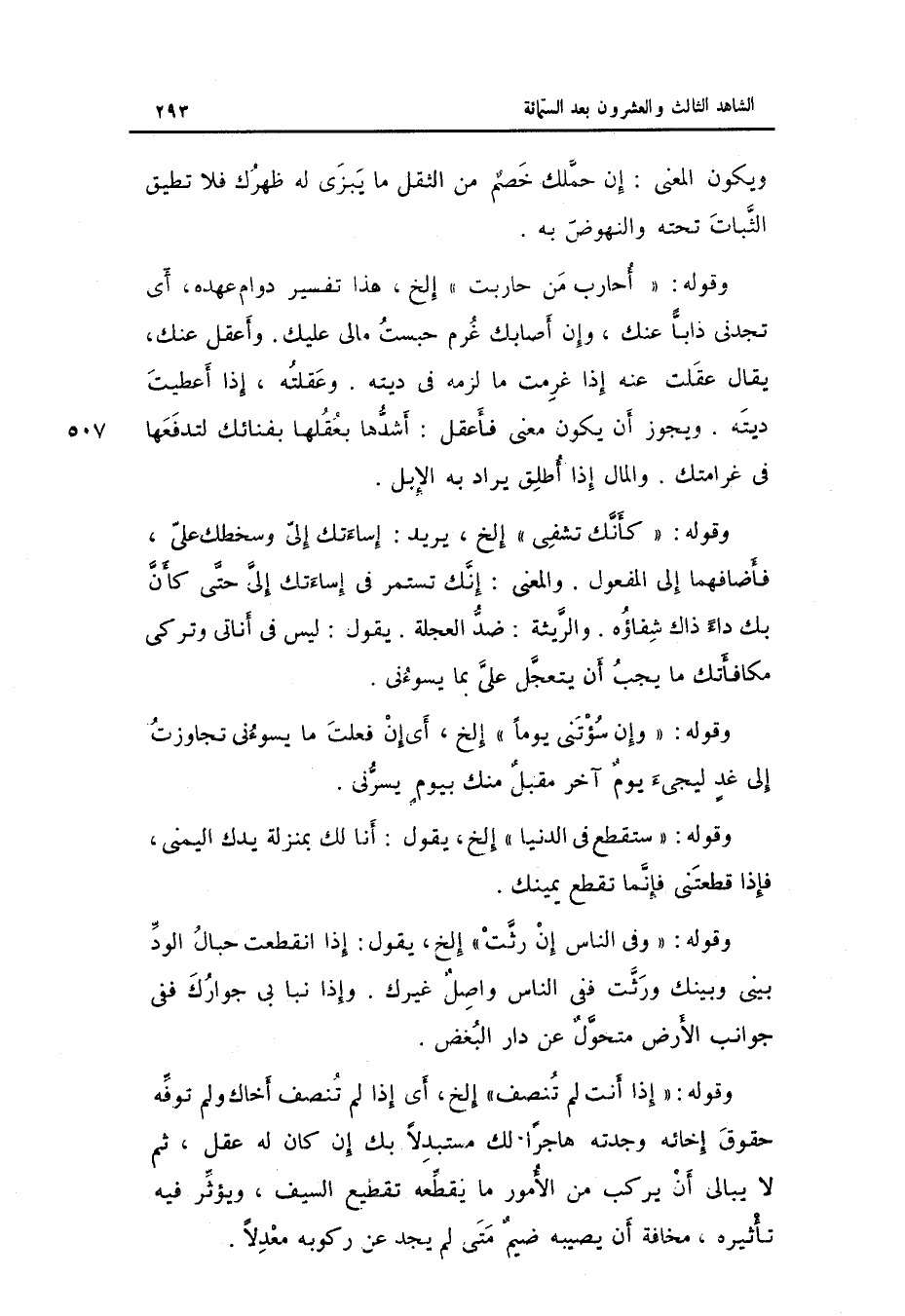 وَقَوله: أُحَارب من حَارَبت إِلَخ هَذَا تَفْسِير دوَام عَهده أَي: تجدني ذاباً عَنْك وَإِن أَصَابَك غرم حبست مَالِي عَلَيْك. وأعقل عَنْك يُقَال: علقت عَنهُ إِذا غرمت مَا لزمَه فِي دِيَته.