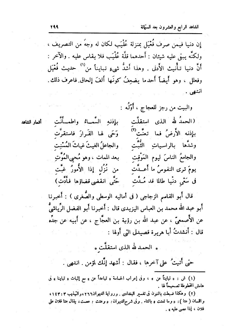 قَالَ أَبُو الْقَاسِم الزجاجي فِي أَمَالِيهِ الْوُسْطَى وَالصُّغْرَى: أخبرنَا أَبُو عبد الله مُحَمَّد بن الْعَبَّاس اليزيدي قَالَ: أخبرنَا أَبُو الْفضل الرياشي عَن الْأَصْمَعِي عَن عبد الله بن رؤبة بن العجاج عَن أَبِيه عَن جده قَالَ: أنشدت أَبَا هُرَيْرَة قصيدتي الَّتِي أَولهَا: الْحَمد لله الَّذِي اسْتَقَلت حَتَّى أتيت على آخرهَا فَقَالَ: أشهد إِنَّك لمُؤْمِن. انْتهى.