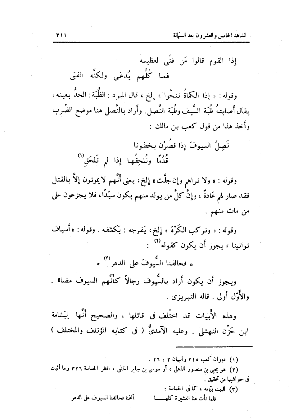وَقَوله: إِذا الكماة تنحوا إِلَخ قَالَ الْمبرد: الظبة: الْحَد بِعَيْنِه يُقَال: أَصَابَته ظبة السَّيْف وظبة النصل. وَأَرَادَ بالنصل هُنَا مَوضِع الضَّرْب وَأخذ هَذَا من قَول كَعْب بن مَالك: الْكَامِل