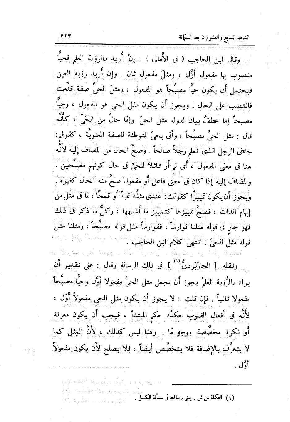 وَنَقله الجاربردي فِي تِلْكَ الرسَالَة وَقَالَ: على تَقْدِير أَن يُرَاد بِالرُّؤْيَةِ الْعلم يجوز أَن يَجْعَل مثل الْحَيّ مَفْعُولا أول وَحيا مصبحاً مَفْعُولا ثَانِيًا. فَإِن قلت: لَا يجوز أَن يكون مثل الْحَيّ مَفْعُولا أول لِأَنَّهُ فِي أَفعَال الْقُلُوب حكمه حكم الْمُبْتَدَأ فَيجب أَن يكون معرفَة أَو نكرَة مخصصة بوجهٍ مَا.