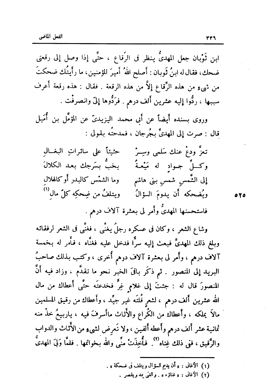 وروى بِسَنَدِهِ أَيْضا عَن أبي مُحَمَّد اليزيدي عَن المؤمل بن أميل قَالَ: صرت إِلَى الْمهْدي بجرجان فمدحته بِقَوْلِي: المتقارب