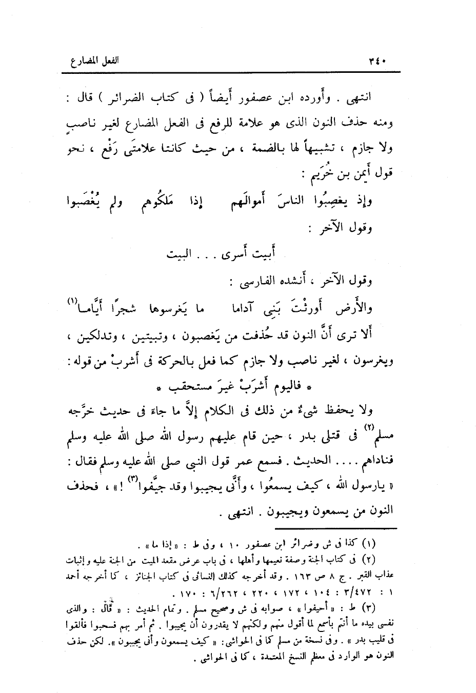 وَأوردهُ ابْن عُصْفُور أَيْضا فِي كتاب الضرائر قَالَ: وَمِنْه حذف النُّون الَّذِي هُوَ عَلامَة للرفع فِي الْفِعْل الْمُضَارع لغير ناصبٍ وَلَا جازم تَشْبِيها لَهَا بالضمة من حَيْثُ كَانَتَا علامتي رفع نَحْو قَول أَيمن بن خريم: المتقارب
