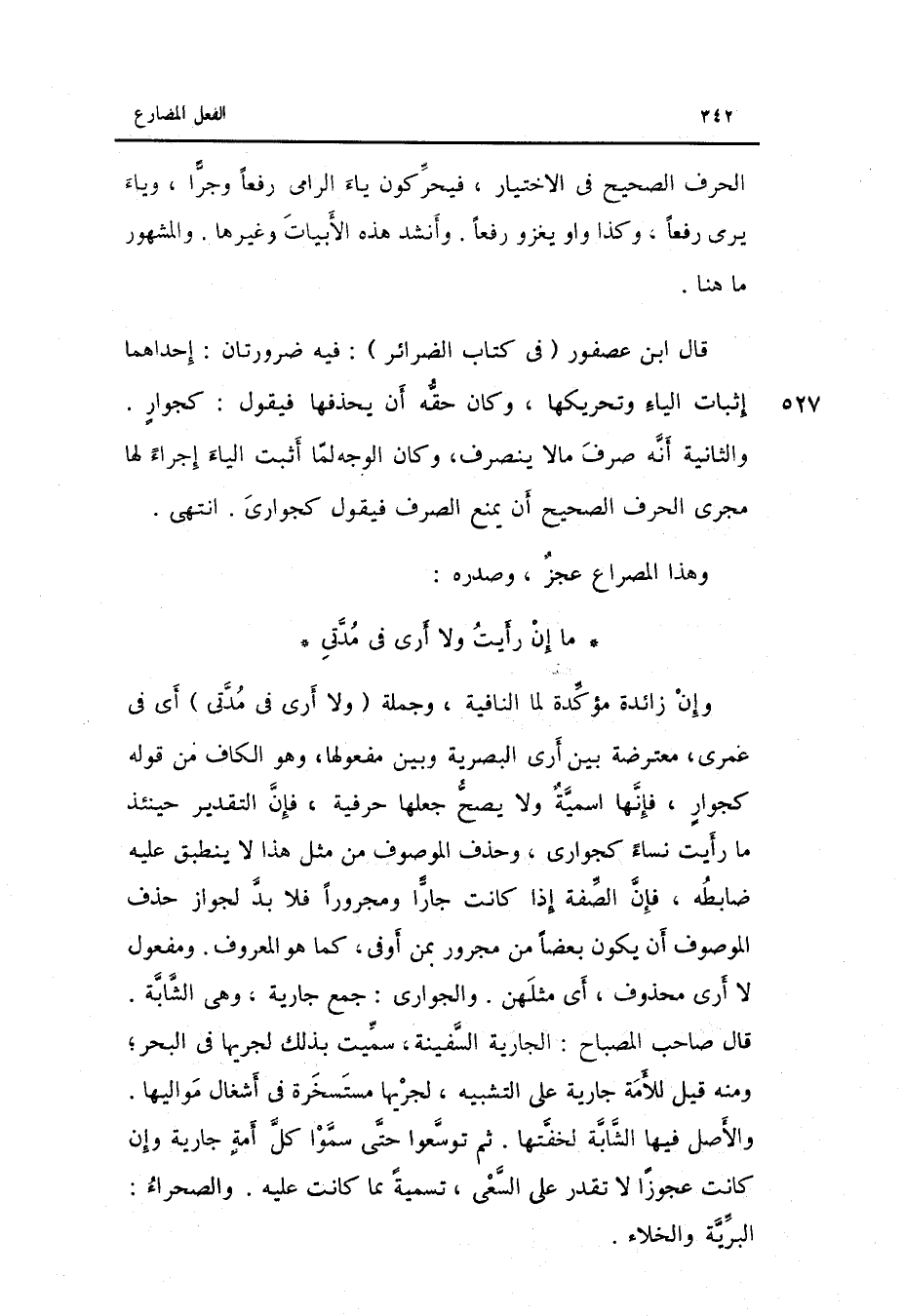 وَالثَّانيَِة: أَنه صرف مَا لَا ينْصَرف وَكَانَ الْوَجْه لما أثبت الْيَاء إِجْرَاء لَهَا مجْرى الْحَرْف الصَّحِيح أَن يمْنَع الصّرْف فَيَقُول كجواري. انْتهى.