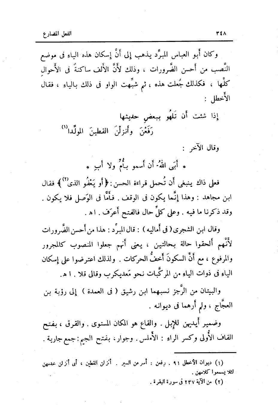 وَقَالَ الآخر: الطَّوِيل أَبى الله أَن أسمو بأمٍّ وَلَا أَب فعلى ذَاك يَنْبَغِي أَن تحمل قِرَاءَة الْحسن: أَو يعْفُو الَّذِي فَقَالَ ابْن مُجَاهِد: وَهَذَا إِنَّمَا يكون فِي الْوَقْف. فَأَما فِي الْوَصْل فَلَا يكون. وَقد ذكرنَا مَا فِيهِ. وعَلى كل حَال فالفتح أعرف. اه وَقَالَ ابْن الشجري فِي أَمَالِيهِ: قَالَ الْمبرد: هَذَا من أحسن الضرورات لأَنهم ألْحقُوا حَالَة بحالتين يَعْنِي أَنهم جعلُوا الْمَنْصُوب كالمجرور وَالْمَرْفُوع مَعَ أَن السّكُون أخف الحركات. وَلذَلِك اعْترضُوا على إسكان الْيَاء فِي ذَوَات الْيَاء من المركبات نَحْو معديكرب وقالي قلا. اه.