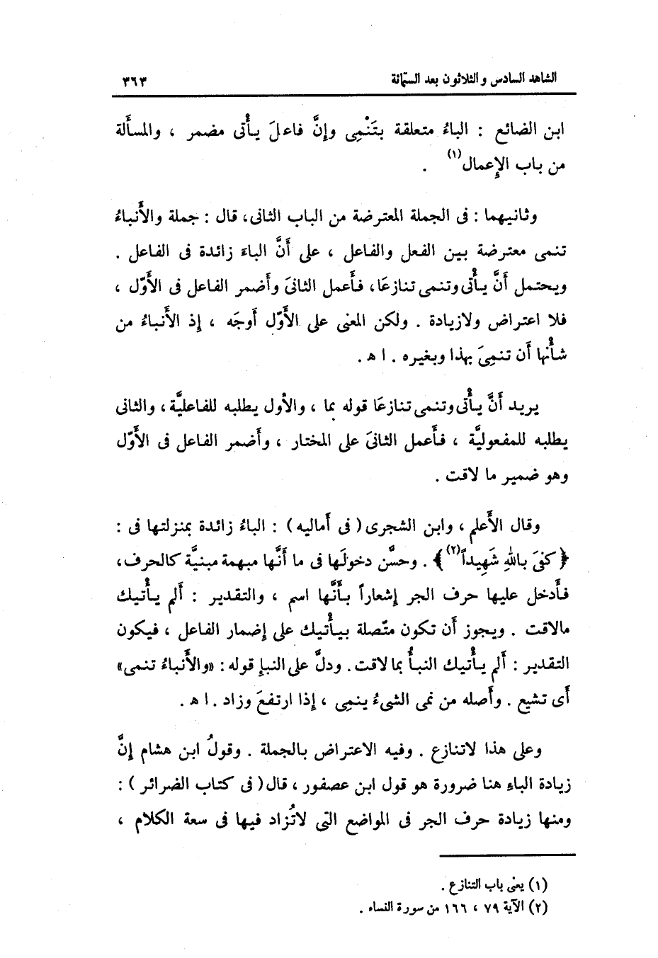 وعَلى هَذَا لَا تنَازع. وَفِيه الِاعْتِرَاض بِالْجُمْلَةِ. وَقَول ابْن هِشَام إِن زِيَادَة الْبَاء هُنَا ضَرُورَة هُوَ قَول ابْن عُصْفُور قَالَ فِي كتاب الضرائر: وَمِنْهَا زِيَادَة حرف الْجَرّ فِي الْمَوَاضِع الَّتِي لَا تزاد فِيهَا فِي سَعَة الْكَلَام