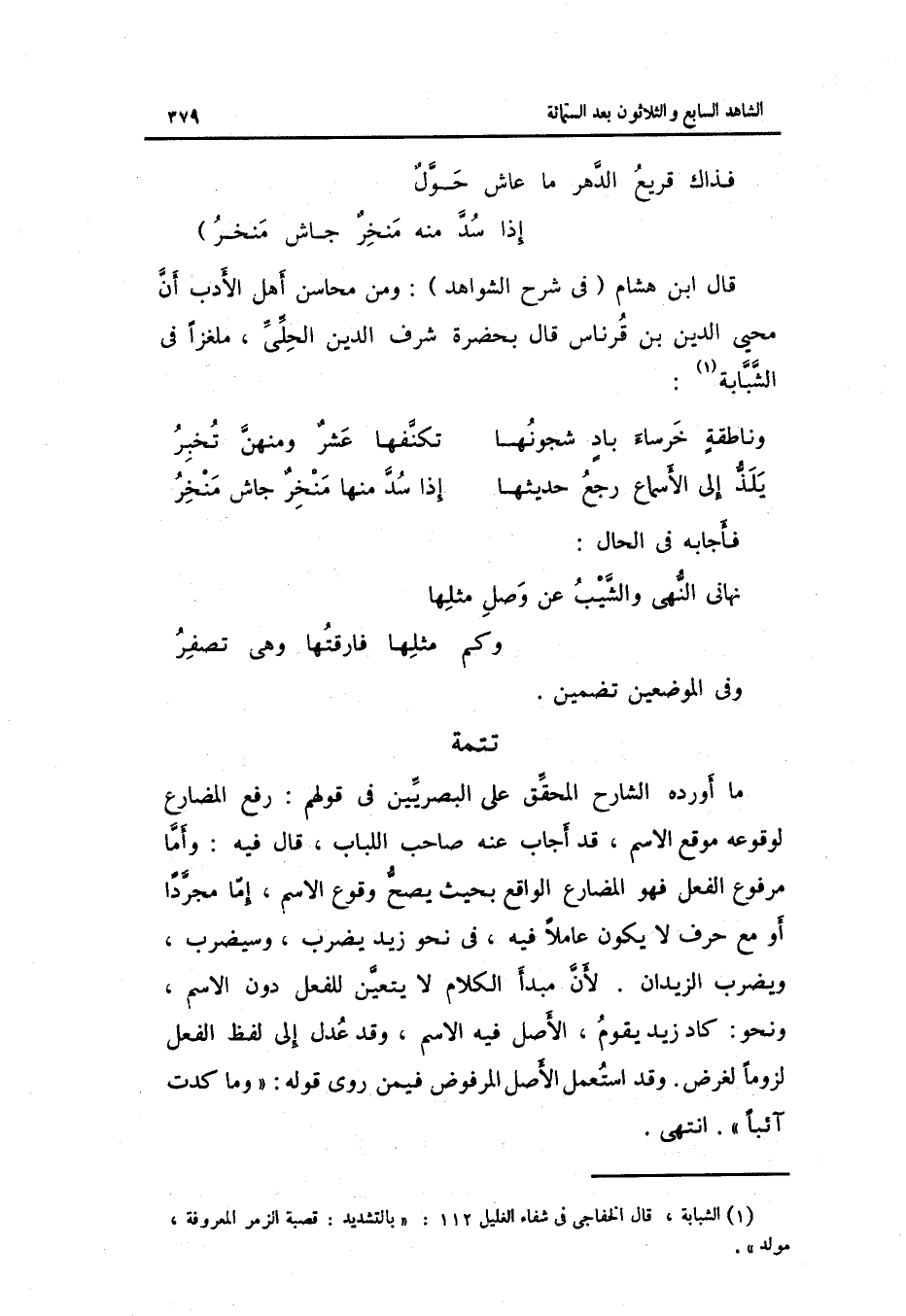 فَأَجَابَهُ فِي الْحَال: الطَّوِيل وَفِي الْمَوْضِعَيْنِ تضمين. تَتِمَّة مَا أوردهُ الشَّارِح الْمُحَقق على الْبَصرِيين فِي قَوْلهم: رفع الْمُضَارع لوُقُوعه موقع الِاسْم قد أجَاب عَنهُ صَاحب اللّبَاب قَالَ فِيهِ: وَأما مَرْفُوع الْفِعْل فَهُوَ الْمُضَارع الْوَاقِع بِحَيْثُ يَصح وُقُوع الِاسْم)