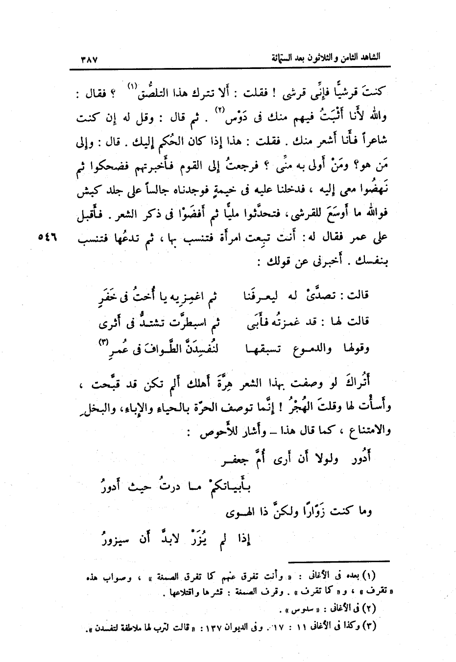 فَقلت: هَذَا إِذا كَانَ الحكم إِلَيْك. قَالَ: وَإِلَى من هُوَ وَمن أولى بِهِ مني فَرَجَعت إِلَى الْقَوْم فَأَخْبَرتهمْ فضحكوا ثمَّ نهضوا معي إِلَيْهِ فَدَخَلْنَا عَلَيْهِ فِي خيمةٍ فوجدناه جَالِسا على جلد كَبْش فوَاللَّه مَا أوسع للقرشي فتحدثوا مَلِيًّا ثمَّ أفضوا فِي ذكر الشّعْر. فَأقبل على عمر فَقَالَ لَهُ: أَنْت تبِعت امْرَأَة فتنسب بهَا ثمَّ تدعها فتنسب بِنَفْسِك.