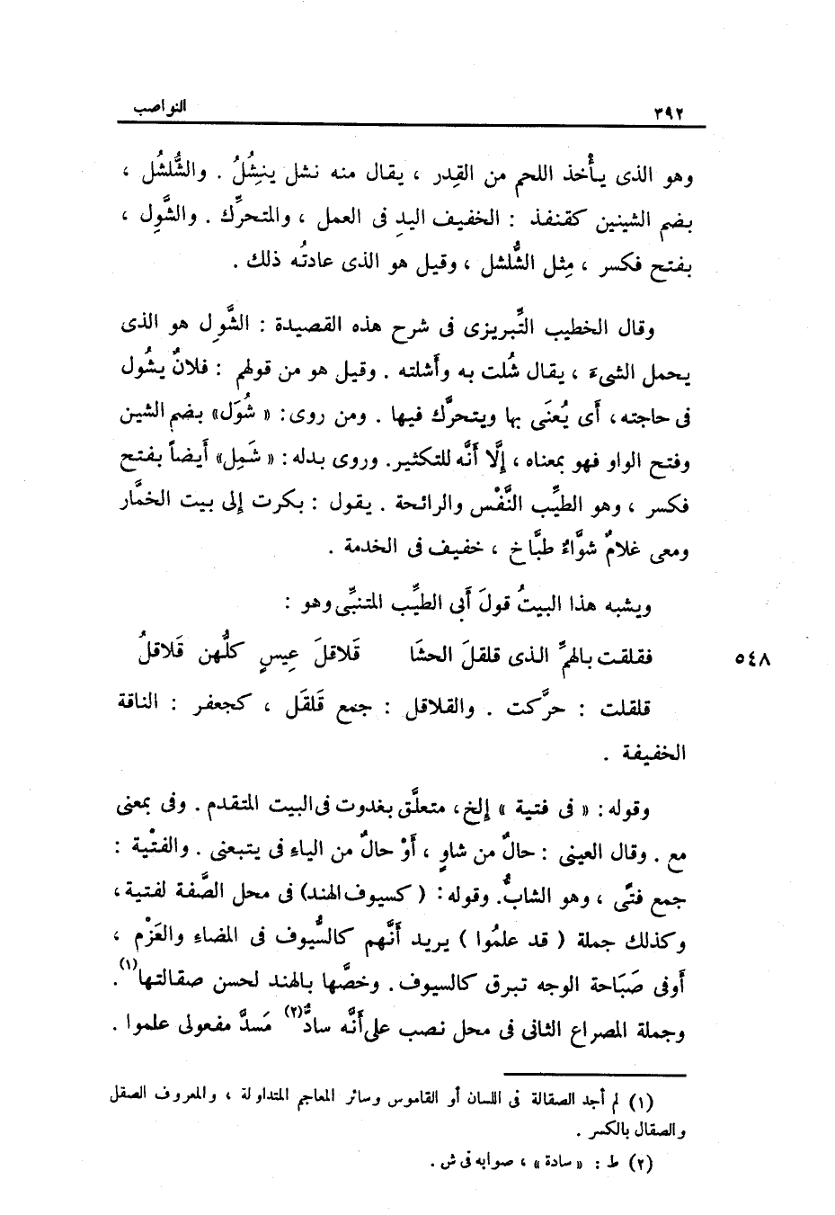 وَقَالَ الْخَطِيب التبريزي فِي شرح هَذِه القصيدة: الشول هُوَ الَّذِي يحمل الشَّيْء يُقَال: شلت بِهِ وأشلته. وَقيل هُوَ من قَوْلهم: فلانٌ يشول فِي حَاجته أَي: يعْنى بهَا ويتحرك فِيهَا. وَمن روى:)