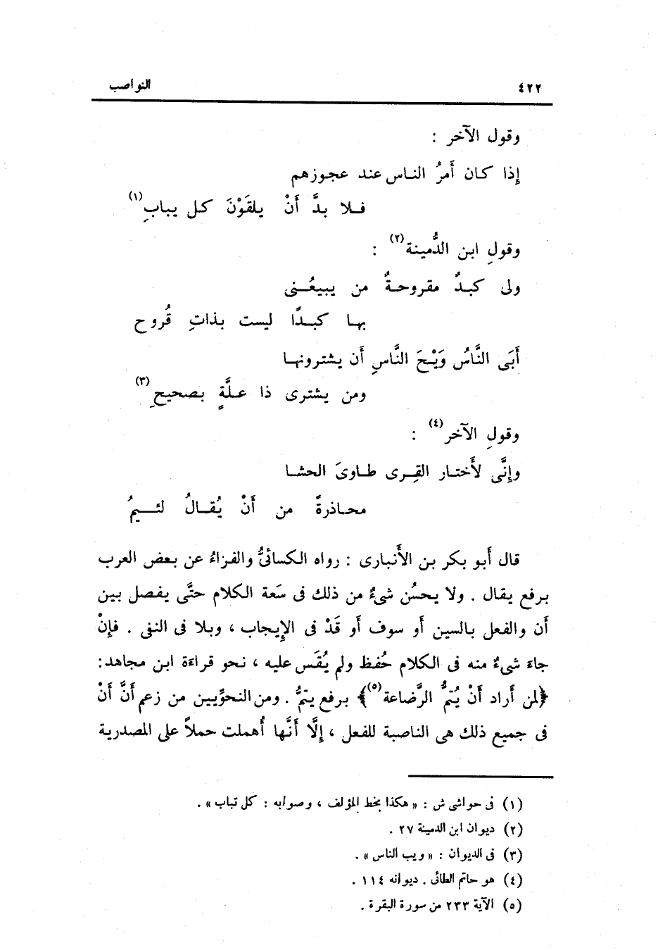 فَإِن جَاءَ شيءٌ مِنْهُ فِي الْكَلَام حفظ وَلم يقس عَلَيْهِ نَحْو قِرَاءَة ابْن مُجَاهِد: لمن أَرَادَ أَن يتم الرضَاعَة بِرَفْع يتم.