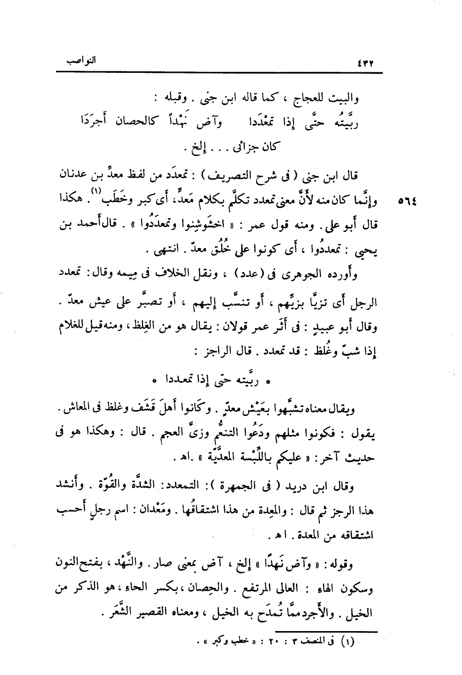 كَانَ جزائي ... . إِلَخ قَالَ ابْن جني فِي شرح التصريف: تمعدد من لفظ معد بن عدنان وَإِنَّمَا كَانَ مِنْهُ لِأَن معنى تمعدد: تكلم بِكَلَام معدٍّ أَي: كبر وخطب. هَكَذَا قَالَ أَبُو عَليّ.