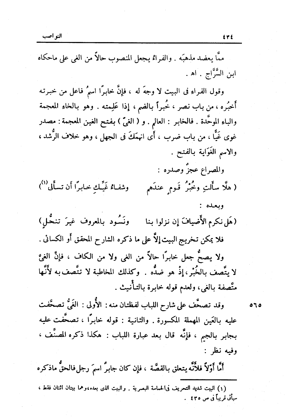 وَالثَّانيَِة: قَوْله خابراً تصحفت عَلَيْهِ بجابر بِالْجِيم فَإِنَّهُ قَالَ بعد عبارَة اللّبَاب: هَكَذَا ذكره المُصَنّف وَفِيه نظر: أما أَولا فَلِأَنَّهُ يتَعَلَّق بالقصة فَإِن كَانَ جابرٌ اسْم رجل فَالْحق مَا ذكره