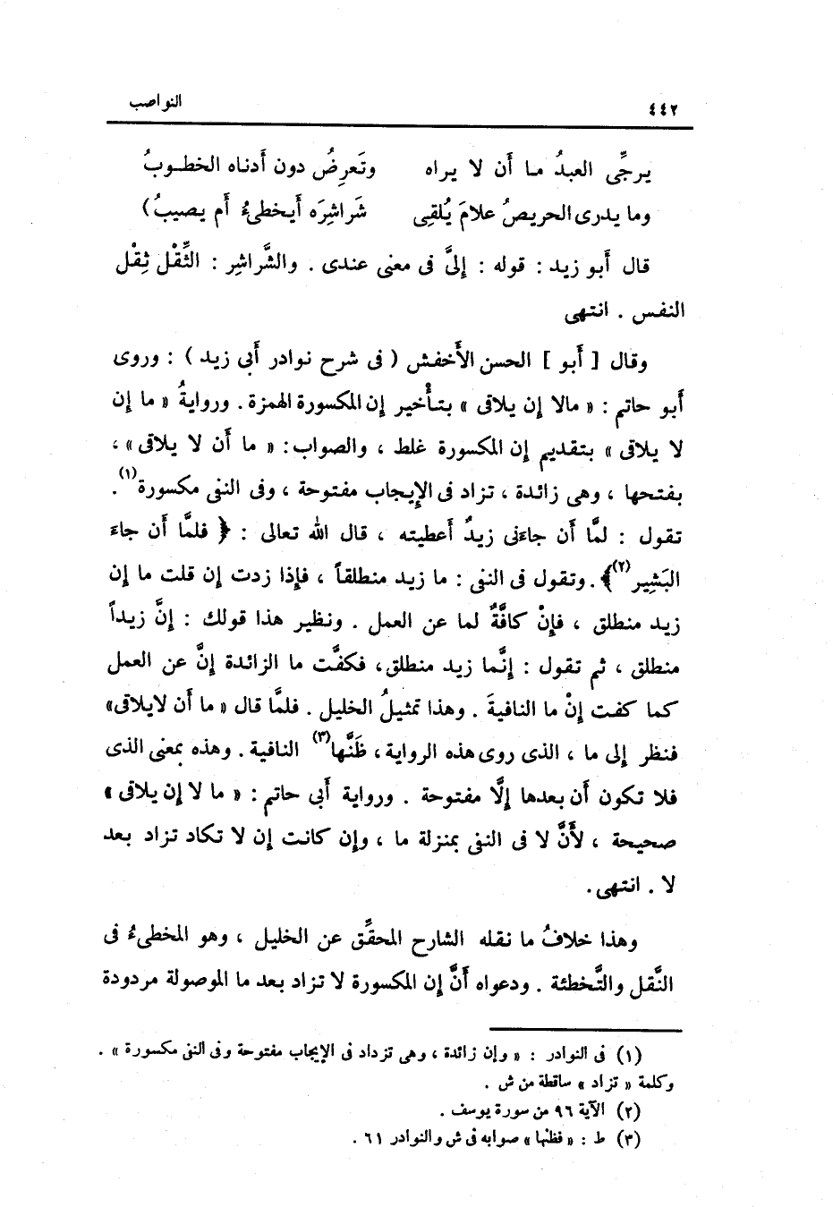 وَهَذِه بِمَعْنى الَّذِي فَلَا تكون أَن بعْدهَا إِلَّا مَفْتُوحَة. وَرِوَايَة أبي حَاتِم: مَا لَا أَن يلاقي صَحِيحَة لِأَن لَا فِي النَّفْي بِمَنْزِلَة مَا وغن كَانَت إِن لَا تكَاد تزاد بعد لَا. انْتهى.