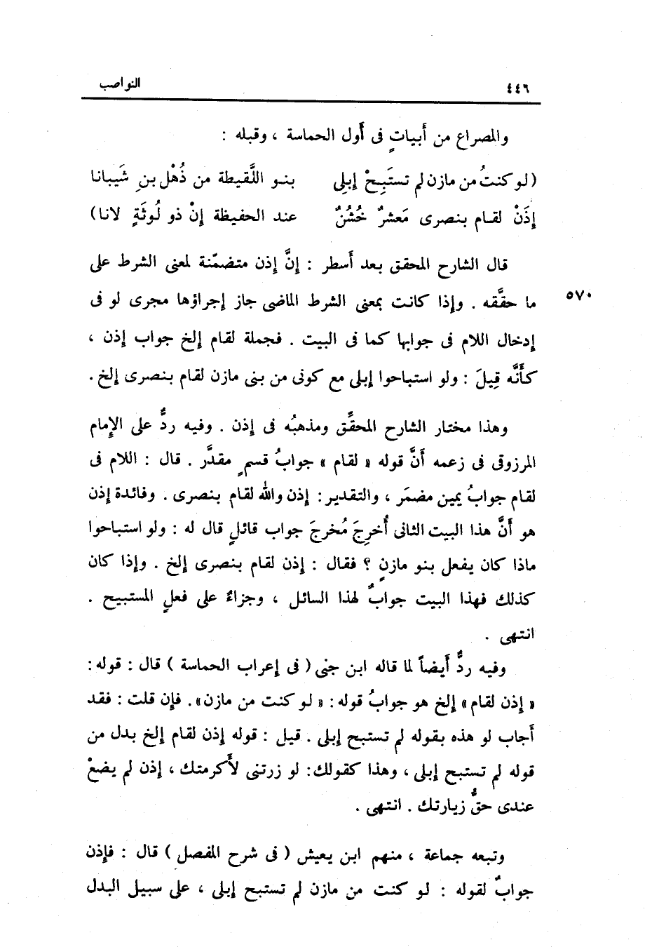 وَفِيه ردٌّ أَيْضا لما قَالَه ابْن جني فِي إِعْرَاب الحماسة قَالَ: قَوْله: إِذن لقام إِلَخ هُوَ جَوَاب قَوْله: لَو)