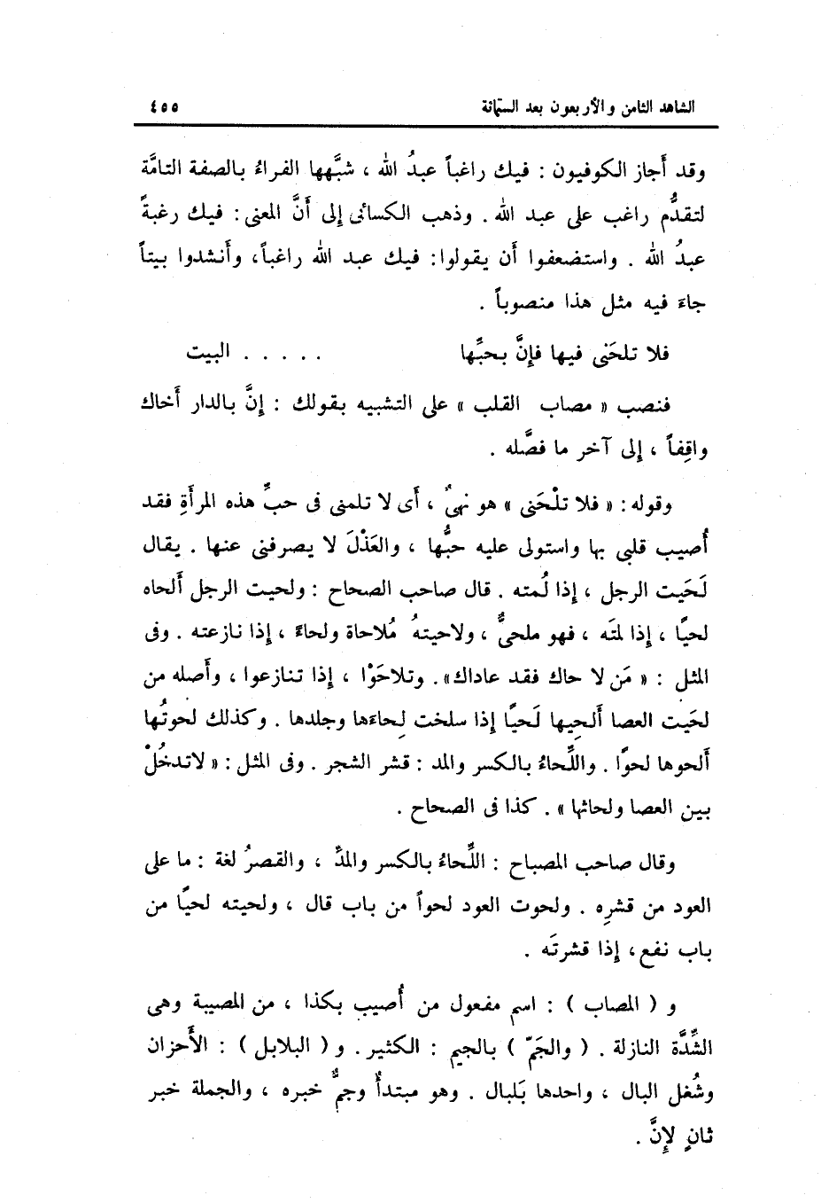 وَقَوله: فَلَا تلحني هُوَ نهيٌ أَي: لَا تلمني فِي حب هَذِه الْمَرْأَة فقد أُصِيب قلبِي بهَا وَاسْتولى عَلَيْهِ حبها والعذل لَا يصرفني عَنْهَا. يُقَال: لحيت الرجل إِذا لمته. قَالَ صَاحب الصِّحَاح: ولحيت الرجل ألحاه لحياً إِذا لمته فَهُوَ ملحيٌّ ولاحيته ملاحاة ولحاءً إِذا نازعته.