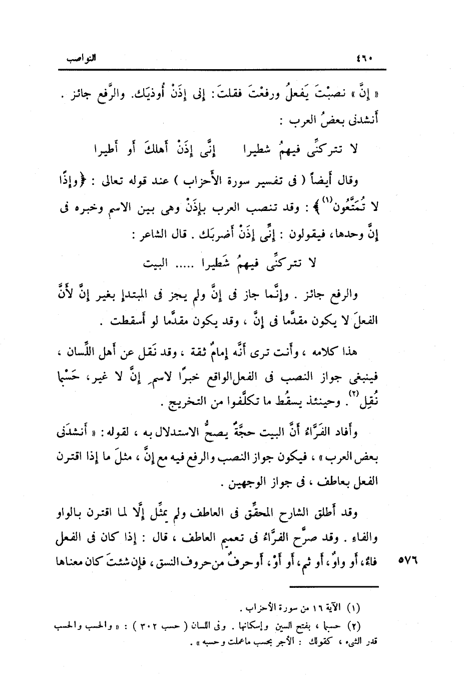 وَأفَاد الْفراء أَن الْبَيْت حجَّة يَصح الِاسْتِدْلَال بِهِ لقَوْله: أَنْشدني بعض الْعَرَب فَيكون جَوَاز وَقد أطلق الشَّارِح الْمُحَقق فِي العاطف وَلم يمثل إِلَّا لما اقْترن بِالْوَاو وَالْفَاء. وَقد صرح الْفراء فِي)