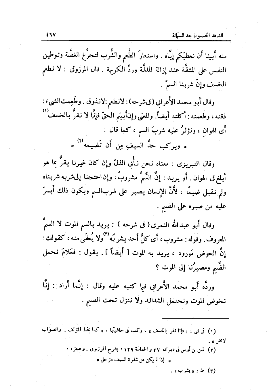 وَقَوله: مشروب أَي: كل أحد يشربه وَلَا يُعْفَى مِنْهُ كَقَوْلِك: إِن الْحَوْض مورود يُرِيد بِهِ الْمَوْت أَيْضا. يَقُول: فعلام نحمل الضيم ومصيرنا إِلَى الْمَوْت ورده أَبُو مُحَمَّد الْأَعرَابِي فِيمَا كتبه عَلَيْهِ وَقَالَ: إِنَّمَا أَرَادَ: إِنَّا نَخُوض الْمَوْت ونحتمل الشدائد وَلَا ننزل تَحت الضيم.)