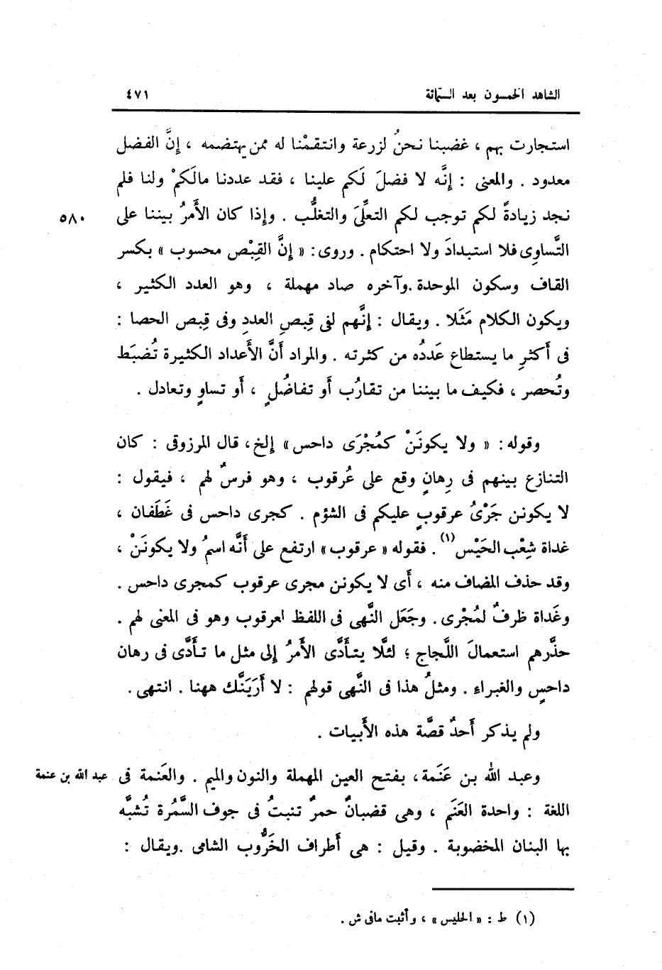 وَقَوله: وَلَا يكونن كمجرى داحس إِلَخ قَالَ المرزوقي: كَانَ التَّنَازُع بَينهم فِي رهانٍ وَقع على عرقوب وَهُوَ فرسٌ لَهُم فَيَقُول: لَا يكونن جري عرقوبٍ عَلَيْكُم فِي الشؤم. كجري داحس فِي غطفان غَدَاة شعب الحيس.