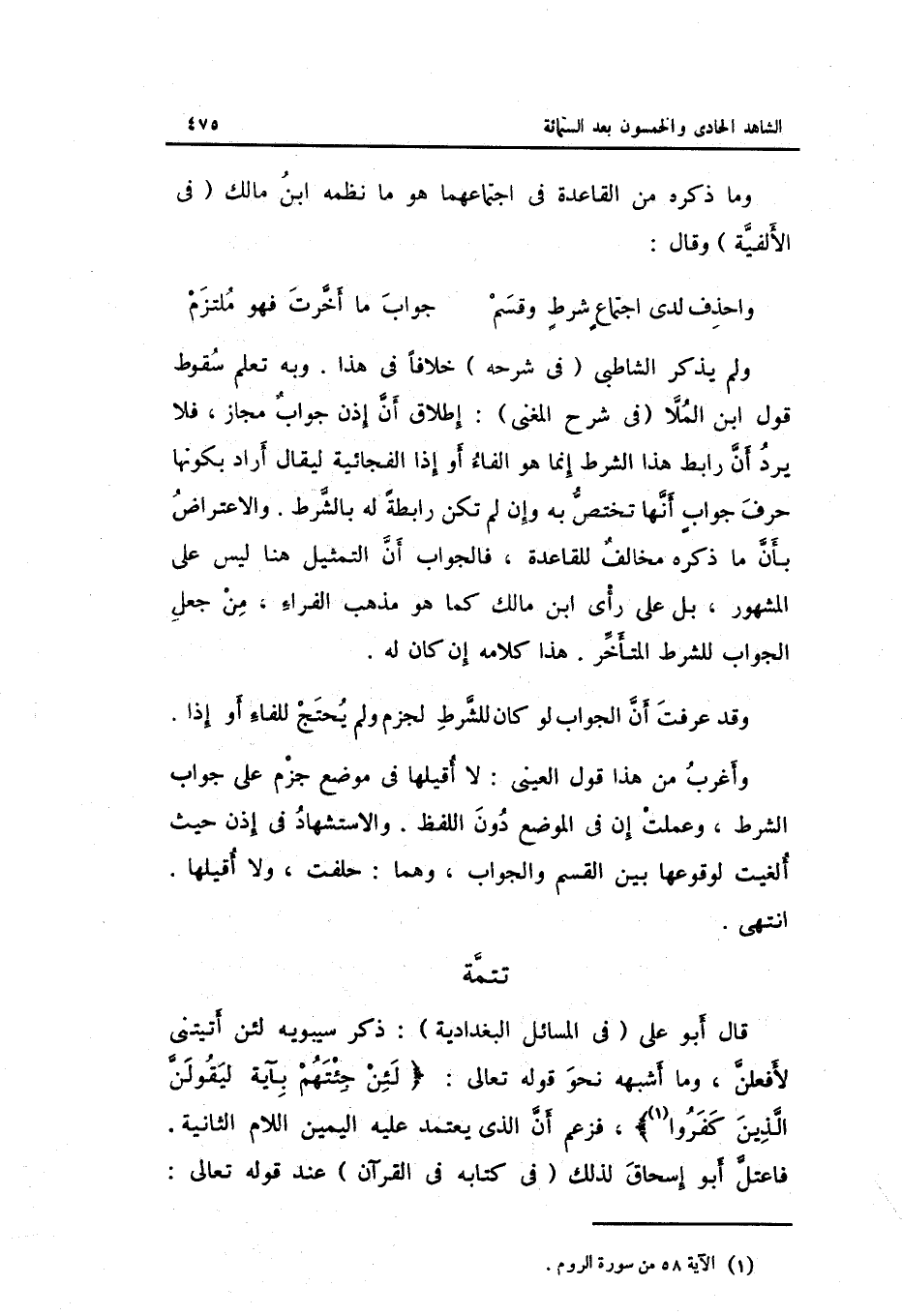 وَلم يذكر الشاطبي فِي شَرحه خلافًا فِي هَذَا. وَبِه تعلم سُقُوط قَول ابْن الملا فِي شرح الْمُغنِي: إِطْلَاق أَن إِذن جوابٌ مجَاز فَلَا يرد أَن رابط هَذَا الشَّرْط إِنَّمَا هُوَ الْفَاء أَو إِذا الفجائية ليقال: أَرَادَ بِكَوْنِهَا حرف جوابٍ أَنَّهَا تخْتَص بِهِ وَإِن لم تكن رابطةً لَهُ بِالشّرطِ.