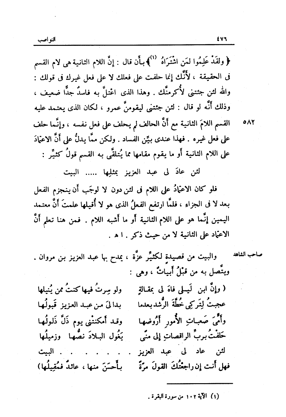 وَهَذَا الَّذِي اعتل بِهِ فاسدٌ جدا ضَعِيف وَذَلِكَ أَنه لَو قَالَ: وَالله لَئِن جئتني ليقومن عَمْرو لَكَانَ الَّذِي يعْتَمد عَلَيْهِ الْقسم اللَّام الثَّانِيَة مَعَ أَن الْحَالِف لم يحلف على فعل نَفسه وَإِنَّمَا حلف على فعل غَيره. فَهَذَا عِنْدِي بَين الْفساد. وَلَكِن مِمَّا يدل على أَن الِاعْتِمَاد على اللَّام الثَّانِيَة أَو مَا يقوم مقَامهَا مِمَّا يتلَقَّى بِهِ الْقسم قَول كثير: لَئِن عَاد لي عبد الْعَزِيز بِمِثْلِهَا ... ... ... الْبَيْت فَلَو كَانَ الِاعْتِمَاد على اللَّام فِي لَئِن دون لَا أقيلها لوَجَبَ أَن ينجزم الْفِعْل بعد لَا فِي الْجَزَاء فَلَمَّا ارْتَفع الْفِعْل الَّذِي هُوَ لَا أقيلها علمت أَن مُعْتَمد الْيَمين إِنَّمَا هُوَ على اللَّام الثَّانِيَة أَو مَا أشبه اللَّام. فَمن هُنَا تعلم أَن الِاعْتِمَاد على الثَّانِيَة لَا من حَيْثُ ذكر. اه.