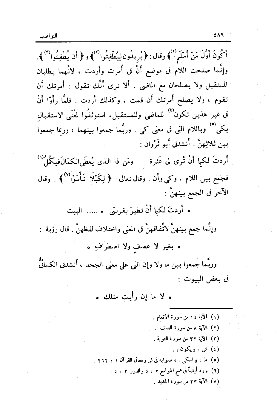 أَنْشدني أَبُو ثروان: الطَّوِيل فَجمع بَين اللَّام وكي وَأَن. وَقَالَ تَعَالَى: لكيلا تأسوا. وَقَالَ الآخر فِي الْجمع بَينهُنَّ: أردْت لكيما أَن تطير بقربتي ... ... ... . . الْبَيْت وَإِنَّمَا جمع بَينهُنَّ لاتفاقهن فِي الْمَعْنى وَاخْتِلَاف لفظهن. قَالَ رؤبة: الرجز بِغَيْر لَا عصفٍ وَلَا اصطراف وَرُبمَا جمعُوا بَين مَا وَلَا وَإِن الَّتِي على معنى الْجحْد أَنْشدني الْكسَائي فِي بعض الْبيُوت: