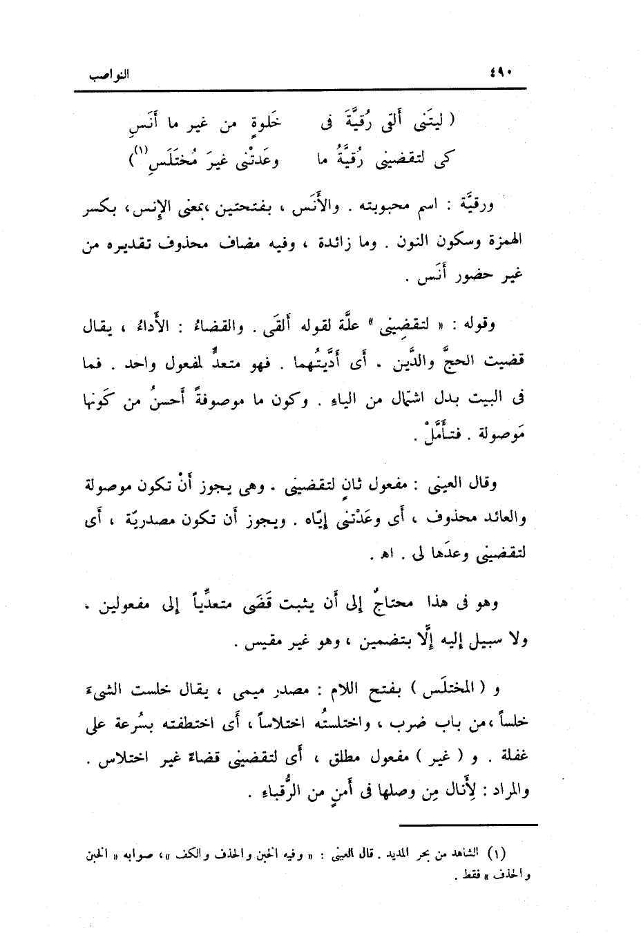 ورقية: اسْم محبوبته. والأنس بِفتْحَتَيْنِ بِمَعْنى الْإِنْس بِكَسْر الْهمزَة وَسُكُون النُّون. وَمَا: وَقَوله: لتقضيني عِلّة لقَوْله ألْقى. وَالْقَضَاء: الْأَدَاء يُقَال: قضيت الْحَج وَالدّين أَي: أديتهما. فَهُوَ متعدٍّ لمفعول وَاحِد. فَمَا فِي الْبَيْت بدل اشْتِمَال من الْيَاء. وَكَون مَا مَوْصُوفَة أحسن من كَونهَا مَوْصُولَة. فَتَأمل.