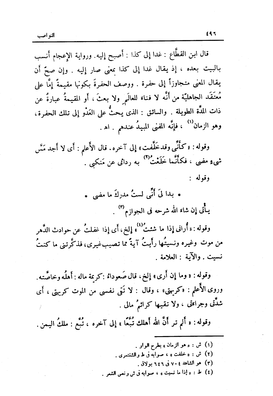 قَالَ ابْن القطاع: غَدا إِلَى كَذَا: أصبح إِلَيْهِ. وَرِوَايَة الإعجام أنسب بِالْبَيْتِ بعده إِذْ يُقَال غَدا إِلَى كَذَا بِمَعْنى صَار إِلَيْهِ. وَإِن صَحَّ أَن يُقَال: الْمَعْنى متجاوزاً إِلَى حُفْرَة. وَوصف الحفرة بِكَوْنِهَا مُقِيمَة إِمَّا على مُعْتَقد الْجَاهِلِيَّة من أَنه لَا فنَاء للْعَالم وَلَا بعث أَو المقيمة عبارةٌ عَن ذَات الْمدَّة الطَّوِيلَة.