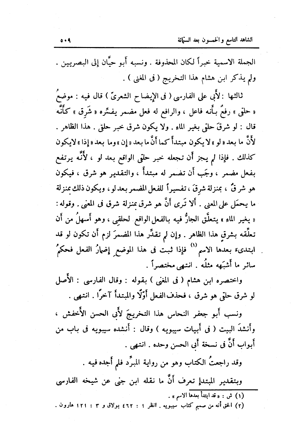 وَاخْتَصَرَهُ ابْن هِشَام فِي الْمُغنِي بقوله: وَقَالَ الْفَارِسِي: الأَصْل لَو شَرق حلقي هُوَ شَرق فَحذف الْفِعْل أَولا والمبتدأ آخرا. انْتهى.