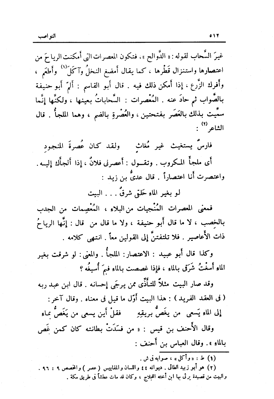 لَو بِغَيْر المَاء حلقي شرقٌ ... ... . الْبَيْت فَمَعْنَى المعصرات المنجيات من الْبلَاء المعصمات من الجدب بِالْخصْبِ لَا مَا قَالَ أَبُو حنيفَة وَلَا مَا قَالَ من قَالَ: إِنَّهَا الرِّيَاح ذَات الأعاصير. فَلَا تلتفتن إِلَى الْقَوْلَيْنِ مَعًا. انْتهى كَلَامه.