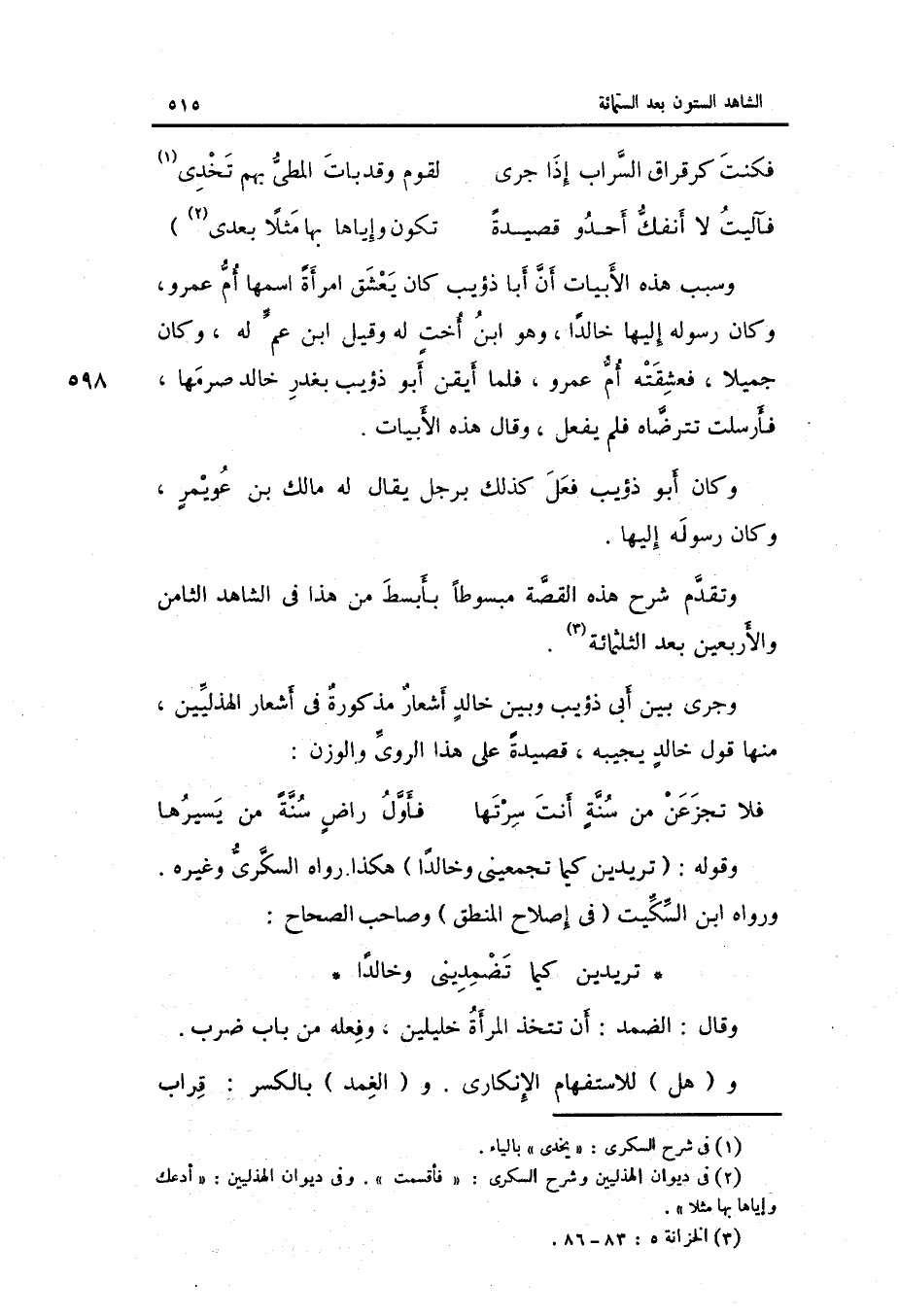 وَسبب هَذِه الأبيات أَن أَبَا ذُؤَيْب كَانَ يعشق امْرَأَة اسْمهَا أم عَمْرو وَكَانَ رَسُوله إِلَيْهَا خَالِدا وَهُوَ ابْن أختٍ لَهُ وَقيل ابْن عمٍّ لَهُ وَكَانَ جميلاً فعشقته أم عَمْرو فَلَمَّا أَيقَن أَبُو ذُؤَيْب بغدر خَالِد صرمها فَأرْسلت تترضاه فَلم يفعل وَقَالَ هَذِه الأبيات.