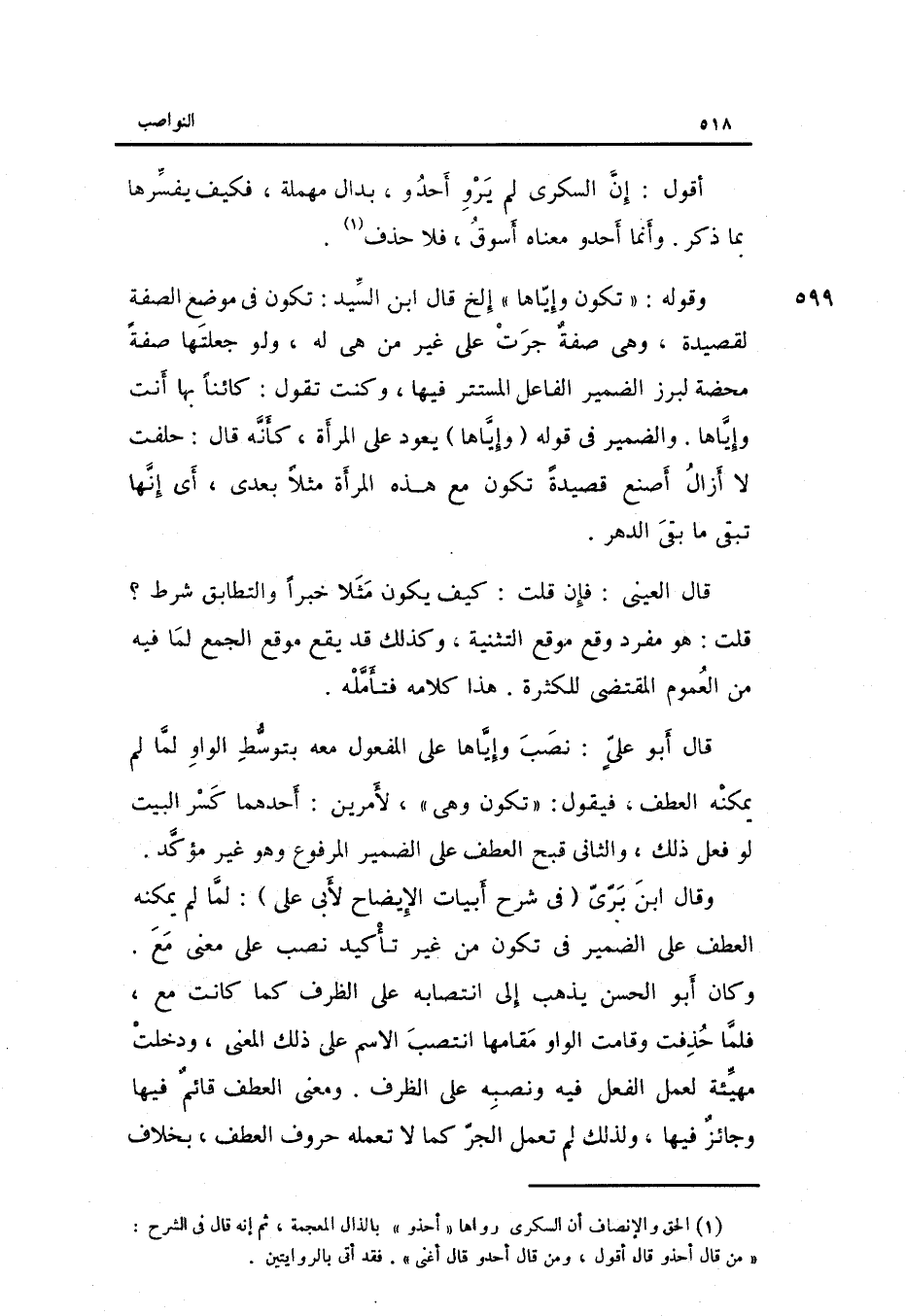 وَقَالَ ابْن بري فِي شرح أَبْيَات الْإِيضَاح لأبي عَليّ: لما لم يُمكنهُ الْعَطف على الضَّمِير فِي تكون من غير تَأْكِيد نصب على معنى مَعَ. وَكَانَ أَبُو الْحسن يذهب إِلَى انتصابه على الظّرْف كَمَا كَانَت مَعَ فَلَمَّا حذفت وَقَامَت الْوَاو مقَامهَا انتصب الِاسْم على ذَلِك الْمَعْنى وَدخلت مهيئة لعمل الْفِعْل فِيهِ ونصبه على الظّرْف.