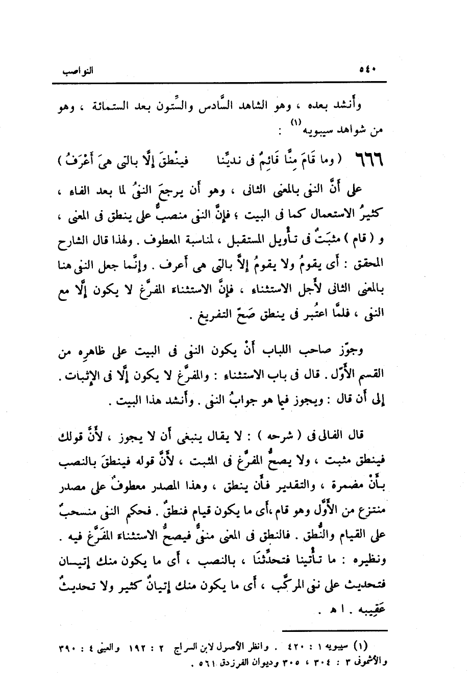 وَلِهَذَا قَالَ الشَّارِح الْمُحَقق: أَي يقوم وَلَا يقوم إِلَّا بِالَّتِي هِيَ أعرف. وَإِنَّمَا جعل النَّفْي هُنَا بِالْمَعْنَى الثَّانِي لأجل الِاسْتِثْنَاء فَإِن الِاسْتِثْنَاء المفرغ لَا يكون إِلَّا مَعَ النَّفْي فَلَمَّا اعْتبر فِي ينْطق صَحَّ وَجوز صَاحب اللّبَاب أَن يكون النَّفْي فِي الْبَيْت على ظَاهره من الْقسم الأول. قَالَ فِي بَاب الِاسْتِثْنَاء: والمفرغ لَا يكون إِلَّا فِي الْإِثْبَات. إِلَى أَن قَالَ: وَيجوز فِيمَا هُوَ جَوَاب النَّفْي. وَأنْشد هَذَا الْبَيْت.
