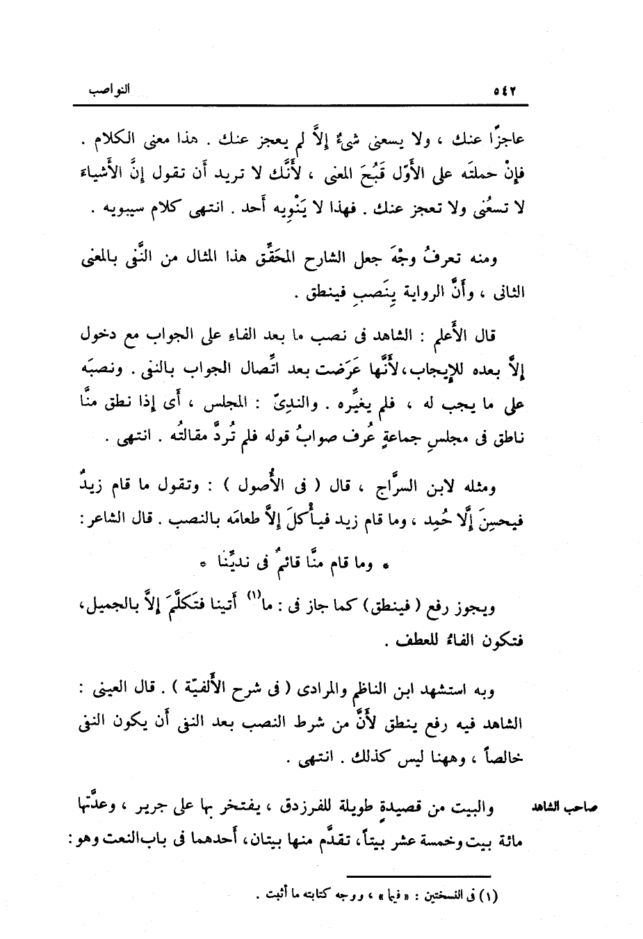 وَبِه اسْتشْهد ابْن النَّاظِم والمرادي فِي شرح الألفية. قَالَ الْعَيْنِيّ: الشَّاهِد فِيهِ رفع ينْطق لِأَن من شَرط النصب بعد النَّفْي أَن يكون النَّفْي خَالِصا وَهَا هُنَا لَيْسَ كَذَلِك. انْتهى.